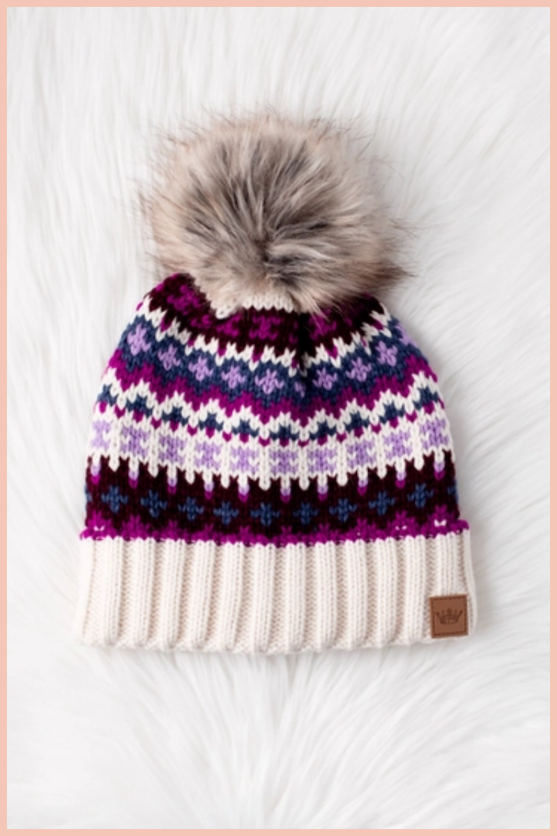 Stay cozy and stylish with our Beige + Purple Patterned Pom Beanie! This beanie features a trendy beige and purple pattern and is accented with a fluffy faux fur pom. The fleece lining will keep you warm and comfortable all day long. Perfect for any winter outfit!