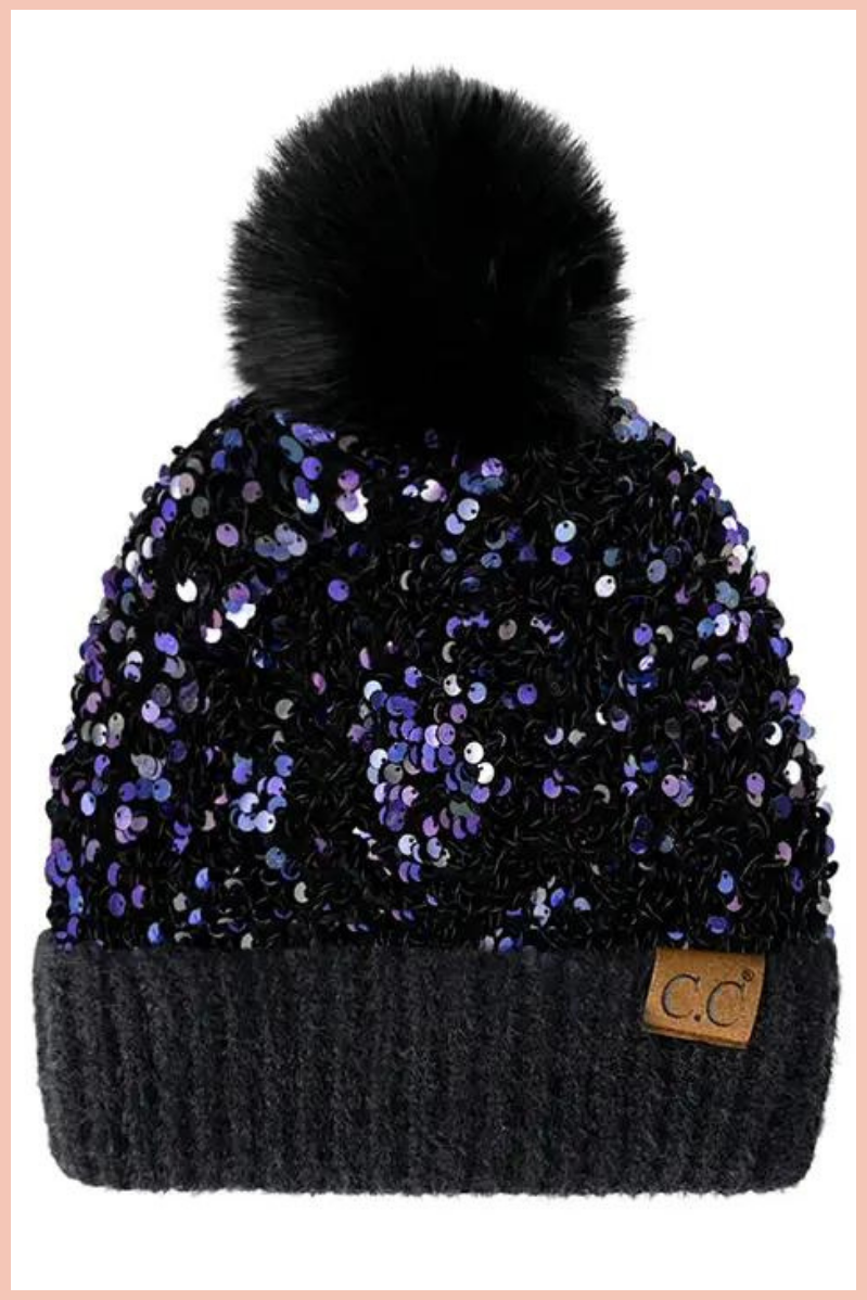 C.C. SEQUIN POM BEANIE | PURPLE/BLACK