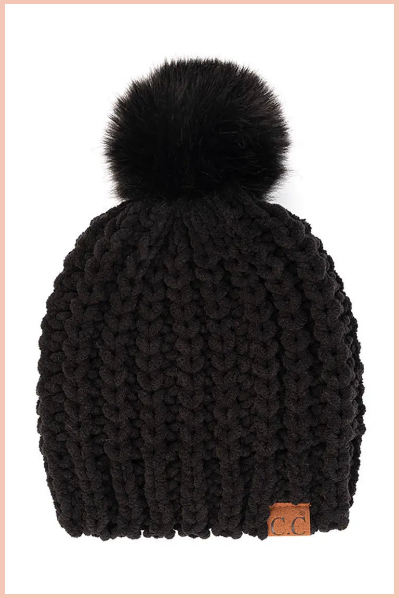 C.C. SOFT CHENILLE CHUNKY YARN POM BEANIE | BLACK