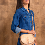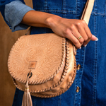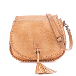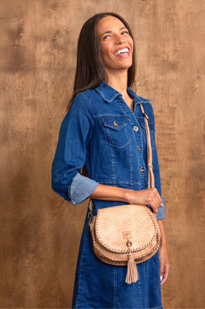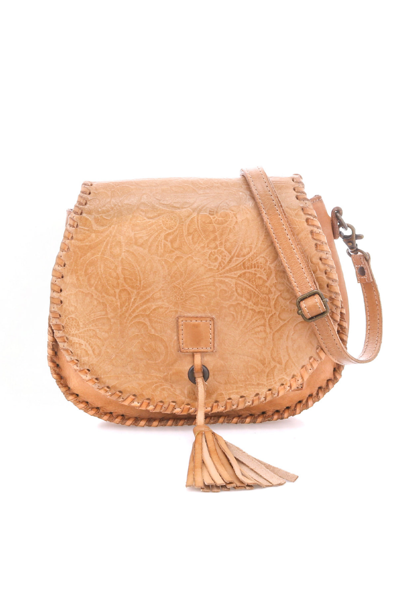 Half Moon is a saddlebag-shaped crossbody purse detailed with an embossed foliage pattern with accentuated whipstitch on edges and finished with a playful leather tassel. For closure, there is a metal clasp, while the interior features a zippered pocket and two slip pockets for easy organization. Complete with an adjustable strap, it's equal parts function and handcrafted charm.