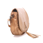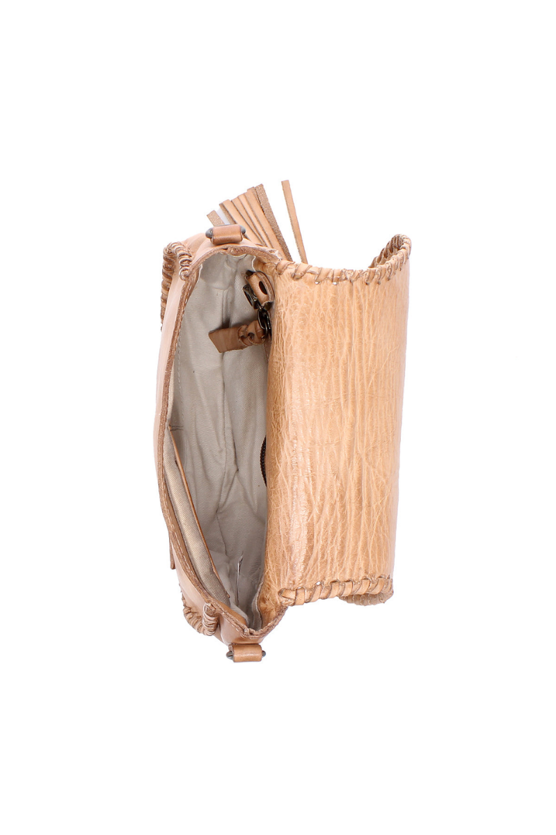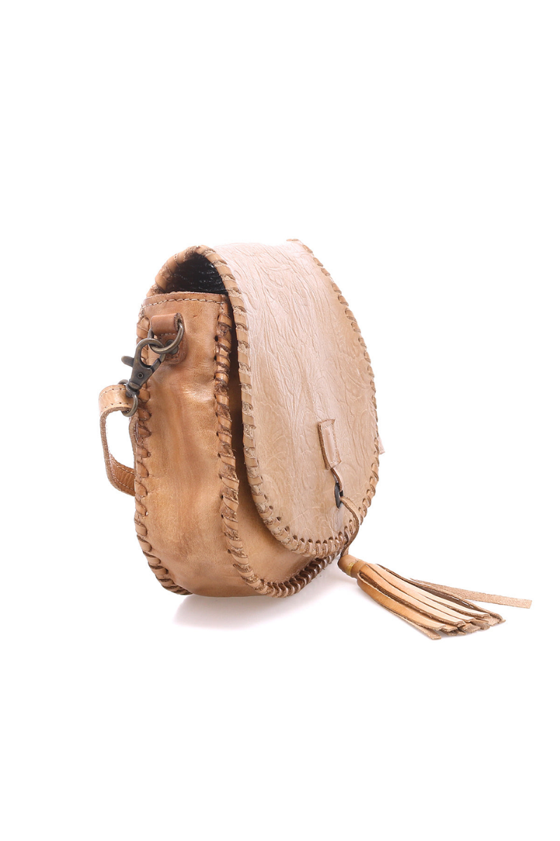 - Saddle bag shaped crossbody with playful leather tassel threaded through a metal grommet