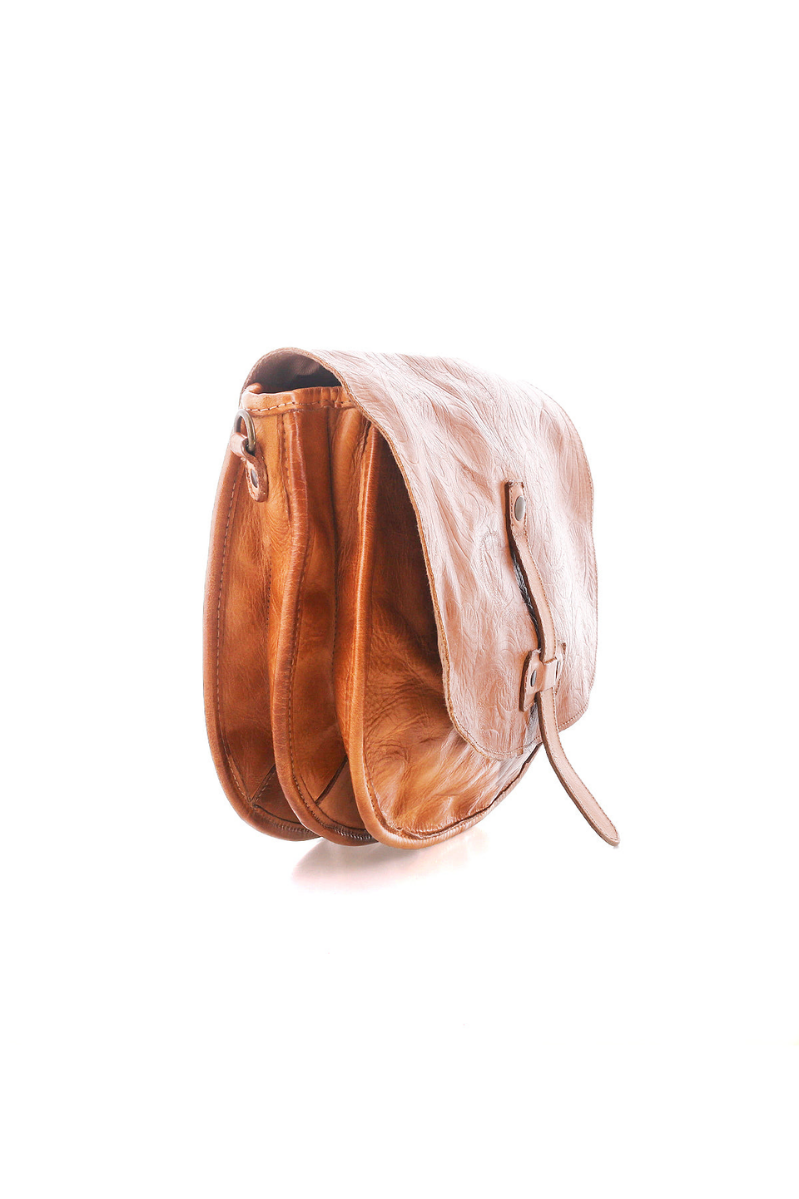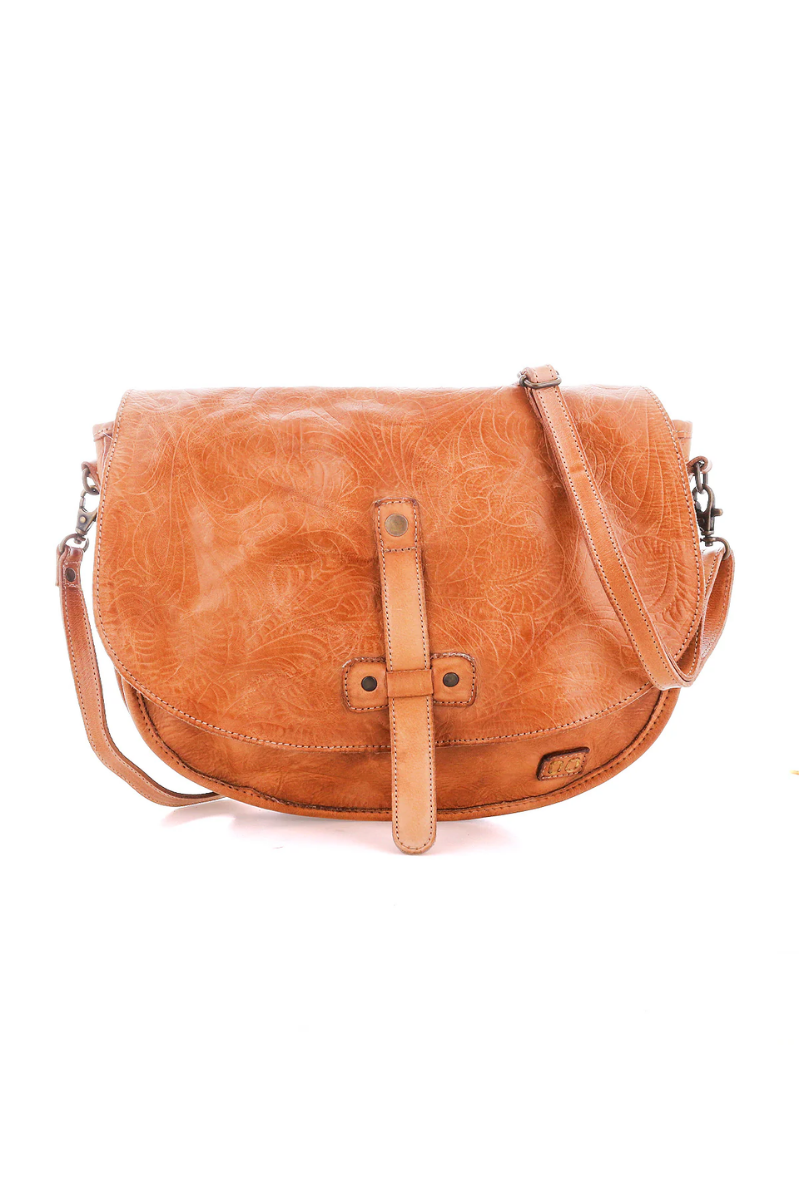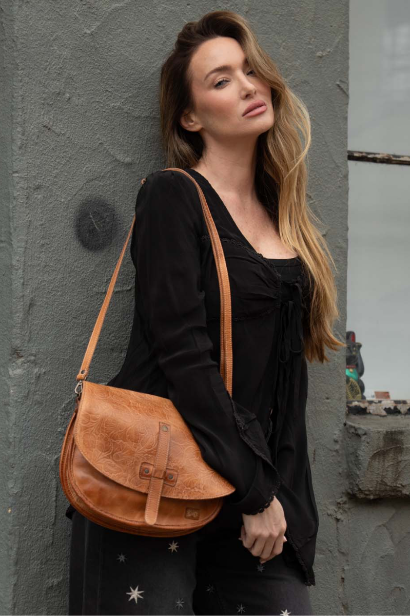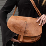 - Classic saddle bag shaped crossbody with embossed foliage design