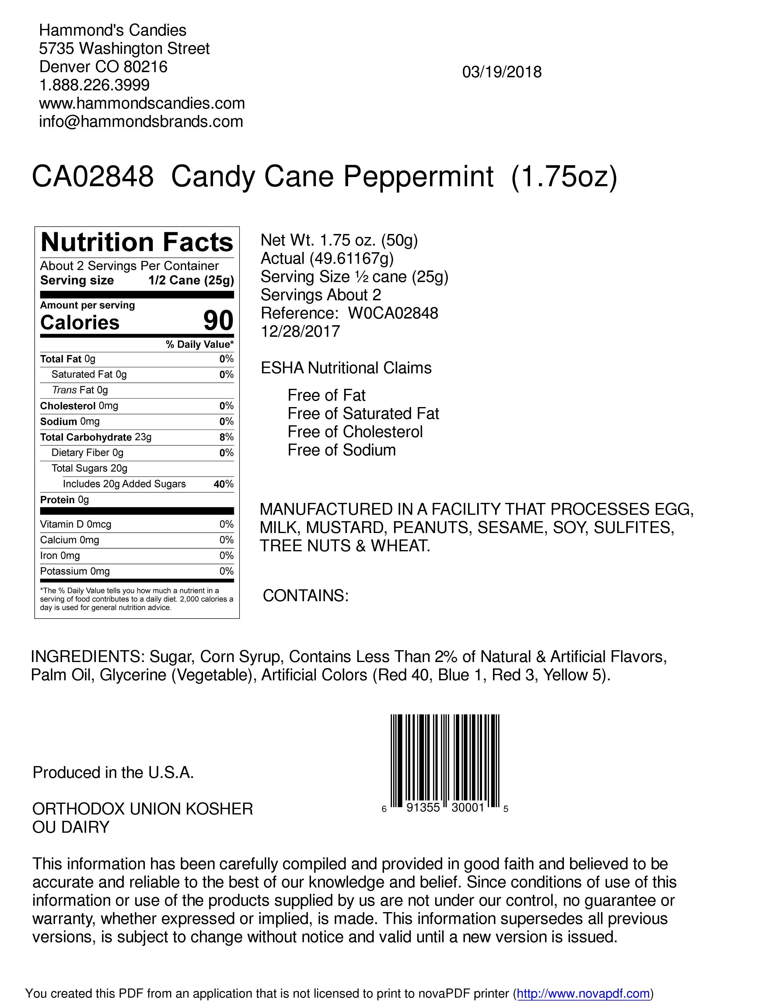 Please note: Hammond's candy canes are handmade and the size may vary. Manufactured in a facility that processes egg, milk, mustard, peanuts, sesame, soy, sulfites, tree nuts, and wheat. Each Cane is individually wrapped.