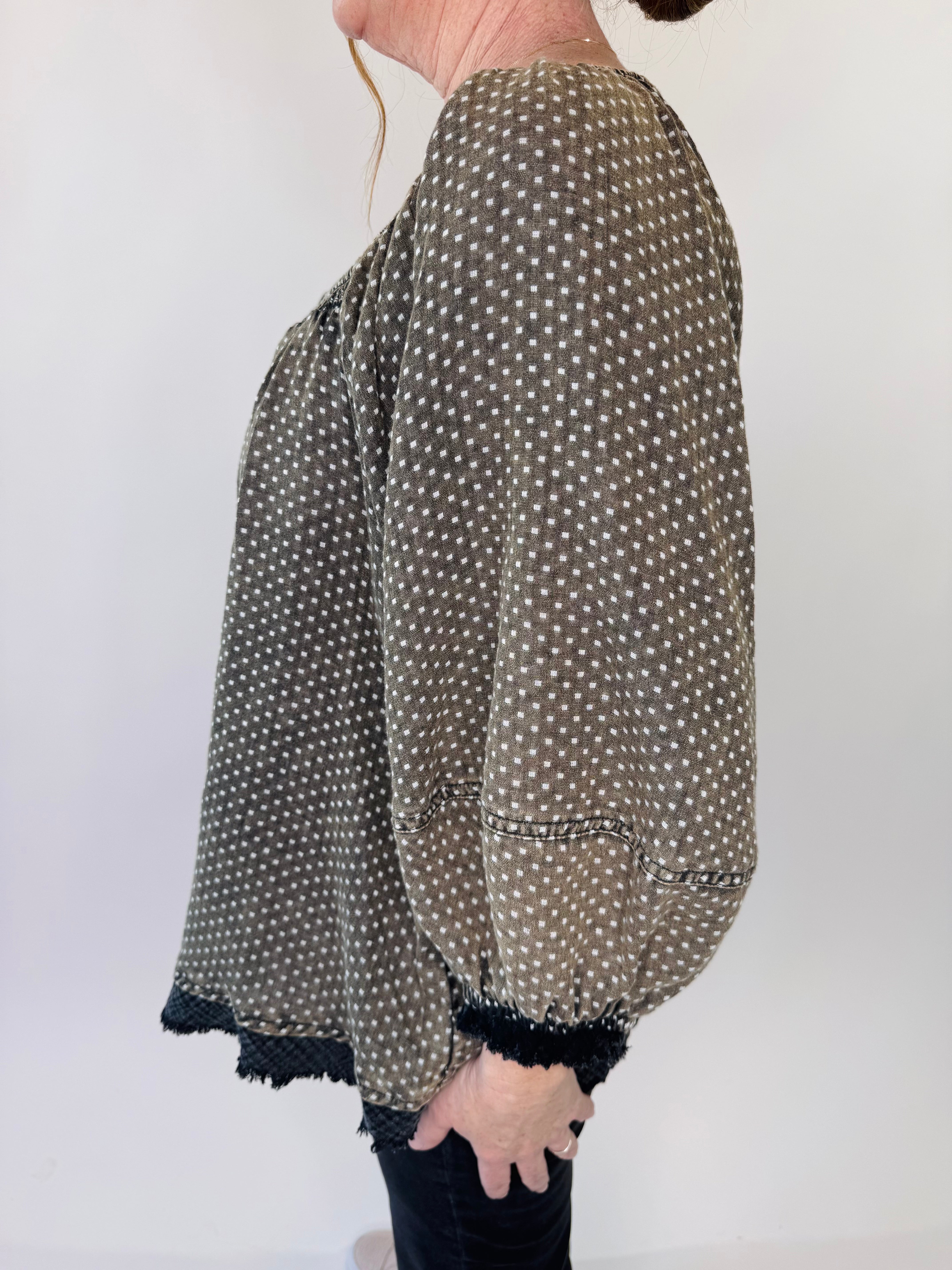 Playful yet effortlessly relaxed, this cotton gauze top brings texture and charm to your everyday lineup. The lightweight woven fabric keeps it breathable, while the soft polka dot print adds just the right amount of personality. Designed with a wide square neckline and puffed 3/4 sleeves, it gives you that easy, lived-in feel with subtle statement details like the raw frayed hem.