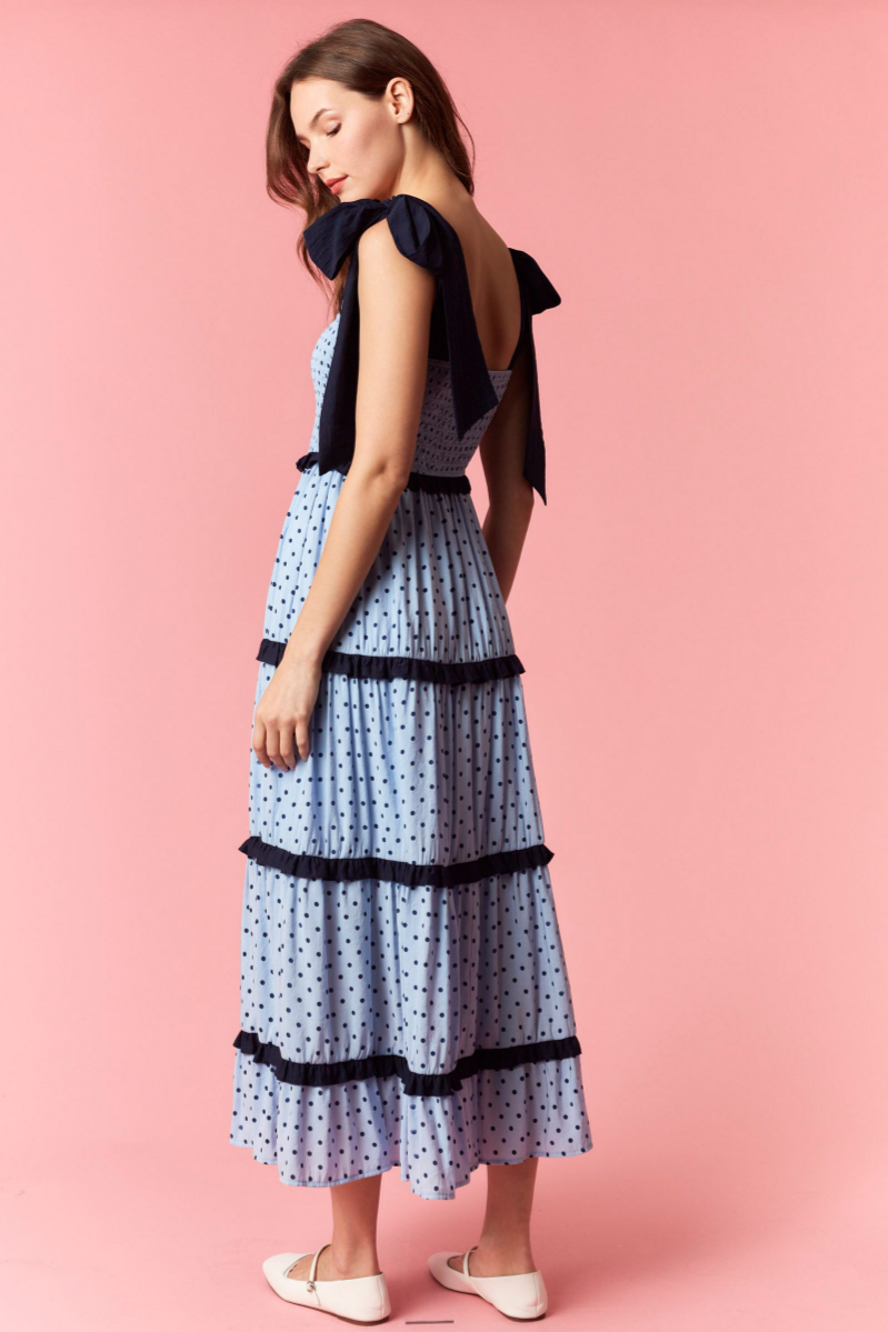 Playful yet effortlessly elegant, this polka dot printed maxi dress is designed to bring charm and movement to your warm-weather wardrobe. Featuring bold solid tie straps and a flattering square neckline, the smocked bodice creates a comfortable, figure-hugging fit while adding texture and structure.