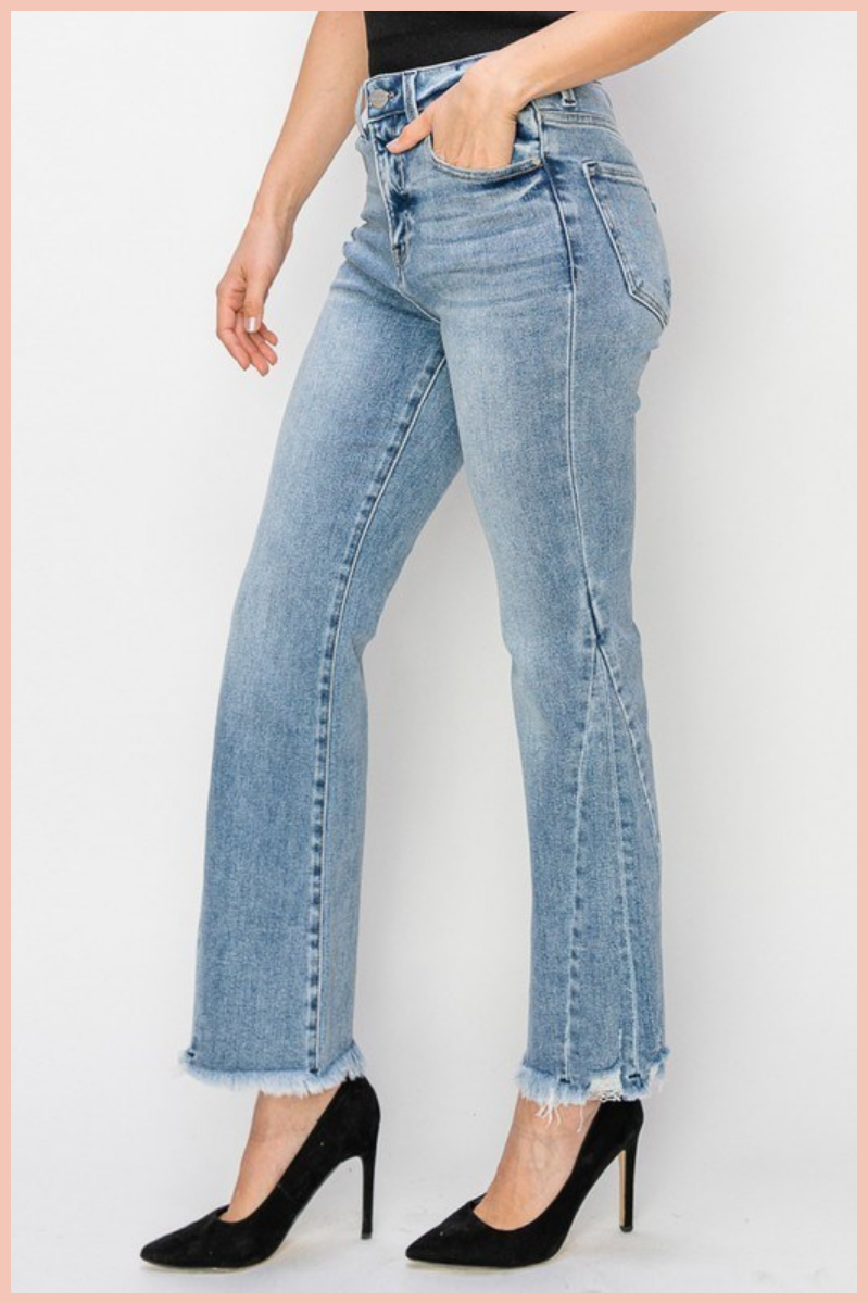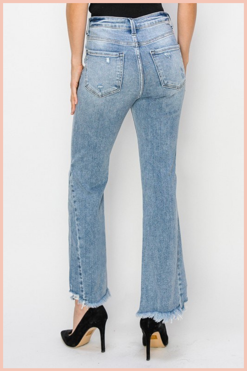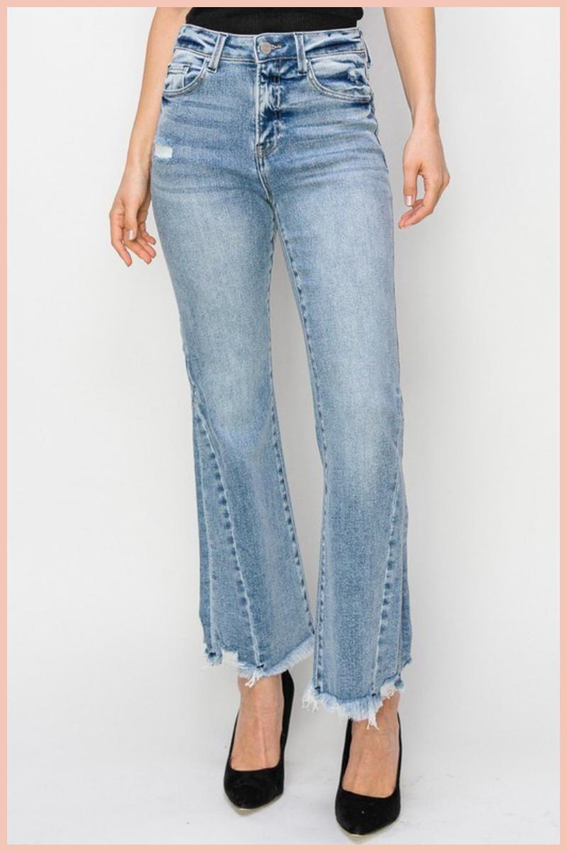 Rock your style with RISEN High Rise Ankle Flare denim. The side seam detail adds a unique touch to these funky, high-waisted jeans. Get ready to turn heads and show off your confident, playful side in these quirky and fun flared denim!