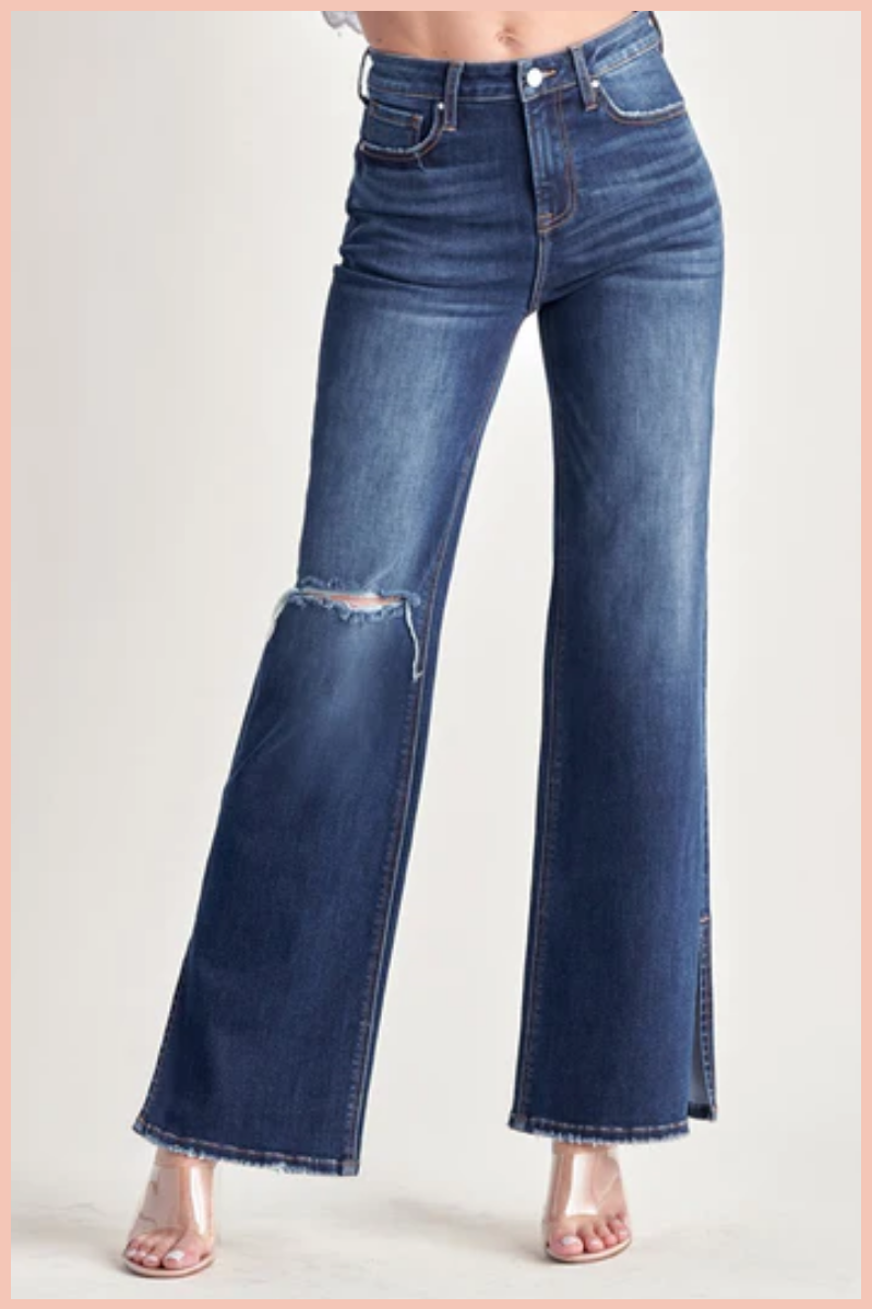 Introducing the RISEN High Rise Distressed Wide Leg Flare in a dark wash. These statement jeans offer a flattering high-rise fit and a trendy wide leg flare. The distressed details add a touch of edge to your look. Perfect for a fun and playful style.
