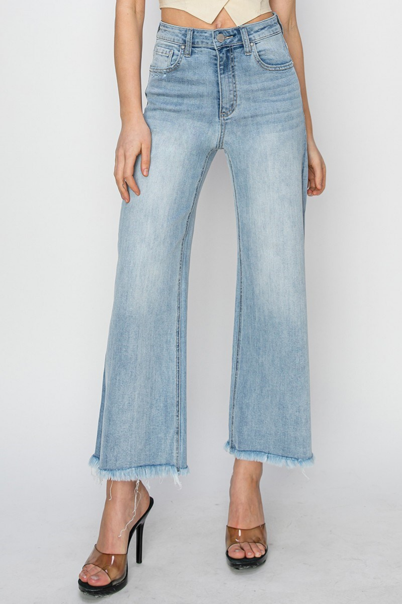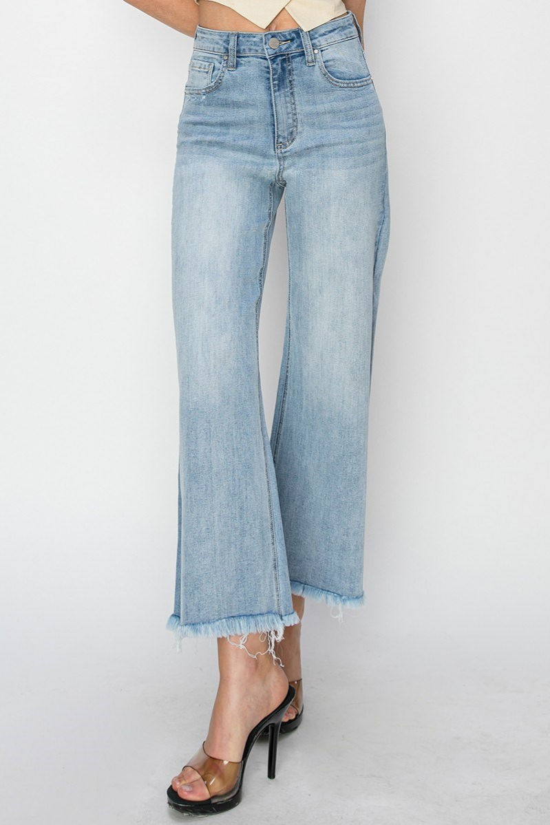 RISEN High Rise Cropped Wide Leg Frayed Denim