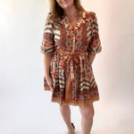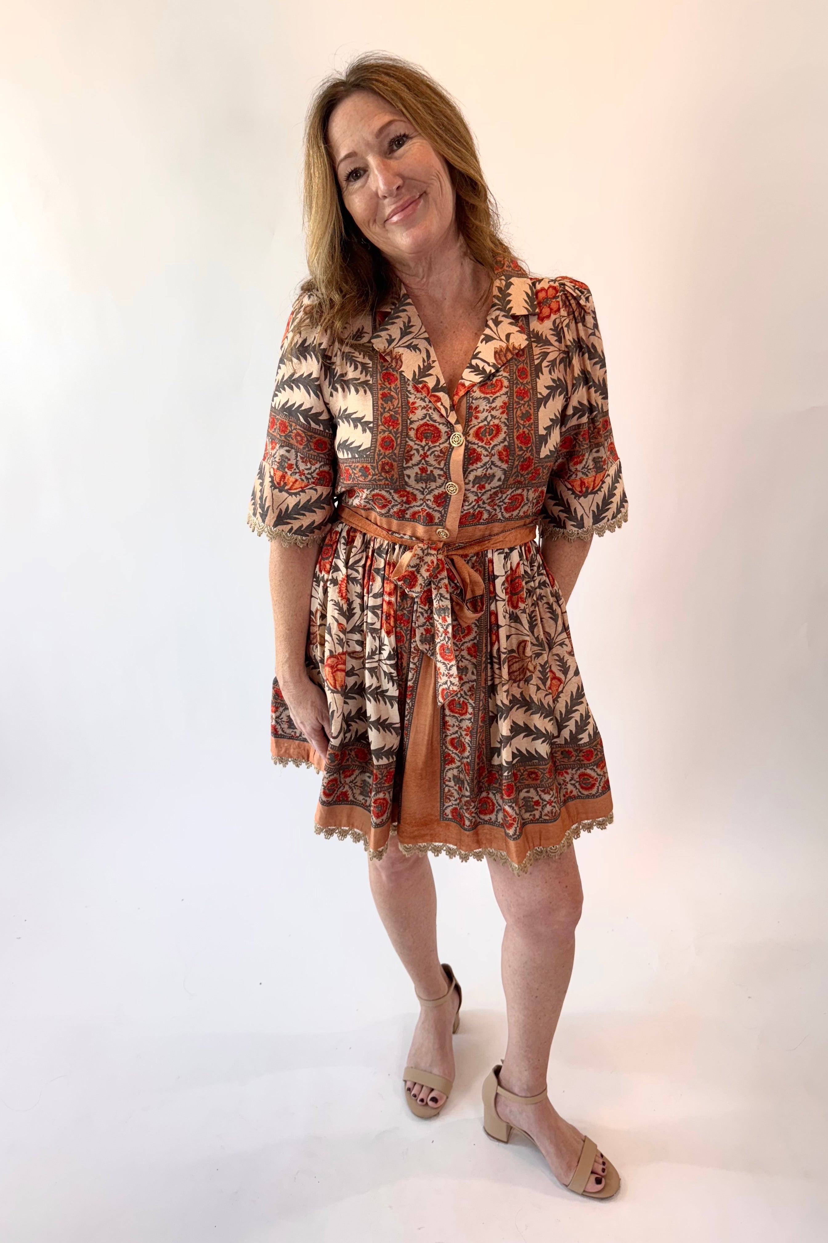 This playful botanical print mini dress adds charm with its short puff sleeves and delicate lace trim at the sleeves and hem. Featuring a button-front closure, elasticated back waist for a comfy fit, and a removable self belt to cinch your silhouette just right. Lightweight and lined for comfort, this woven dress also offers handy side pockets for your essentials. Perfect for sunny days and casual outings with a flirty, fun vibe.