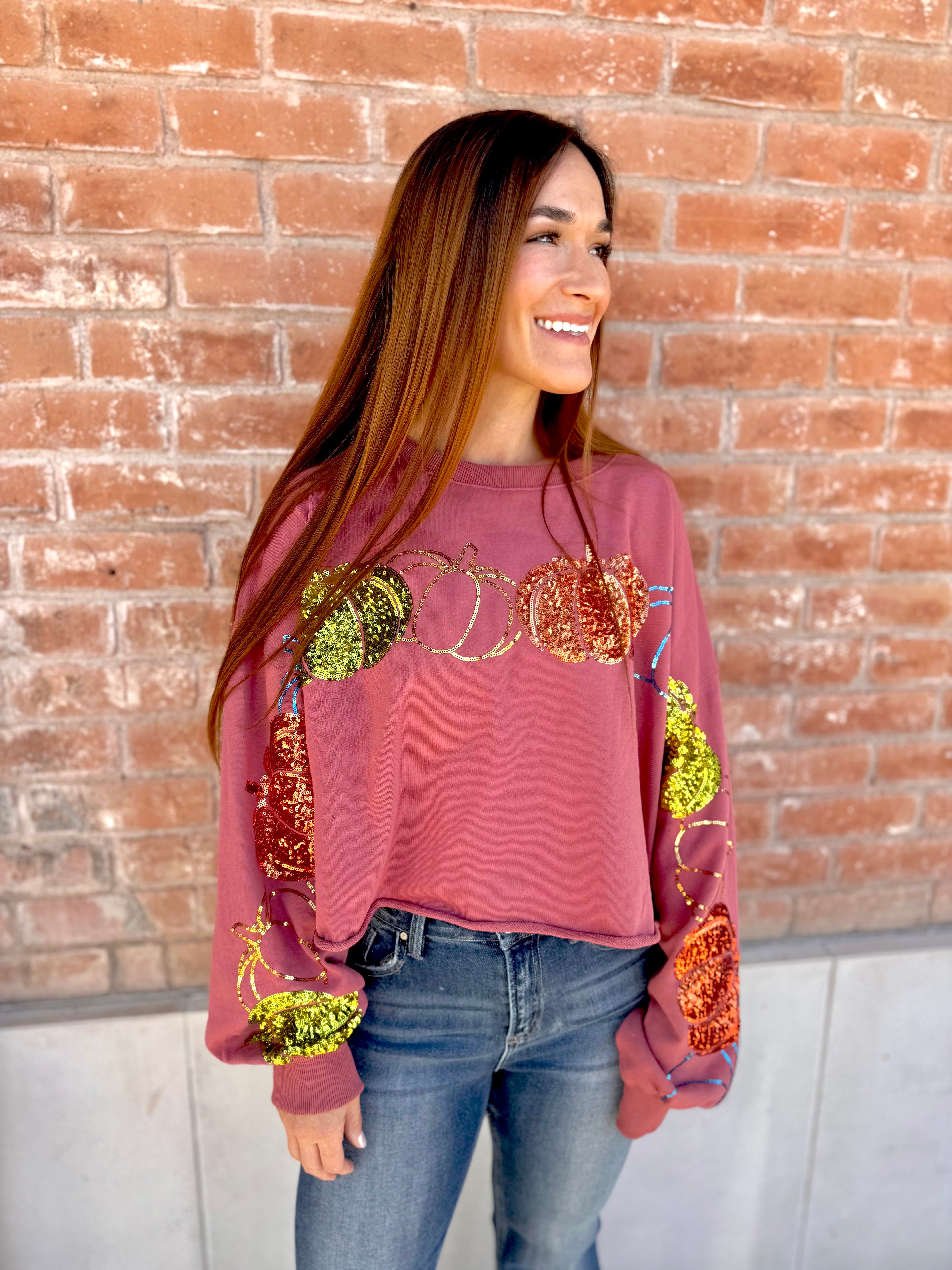 Get ready to be the talk of your Thanksgiving dinner with our Pumpkin Sequins Cropped Sweatshirt. This cream-colored sweatshirt features playful pumpkin sequin embroidery, adding a touch of whimsy to any outfit.