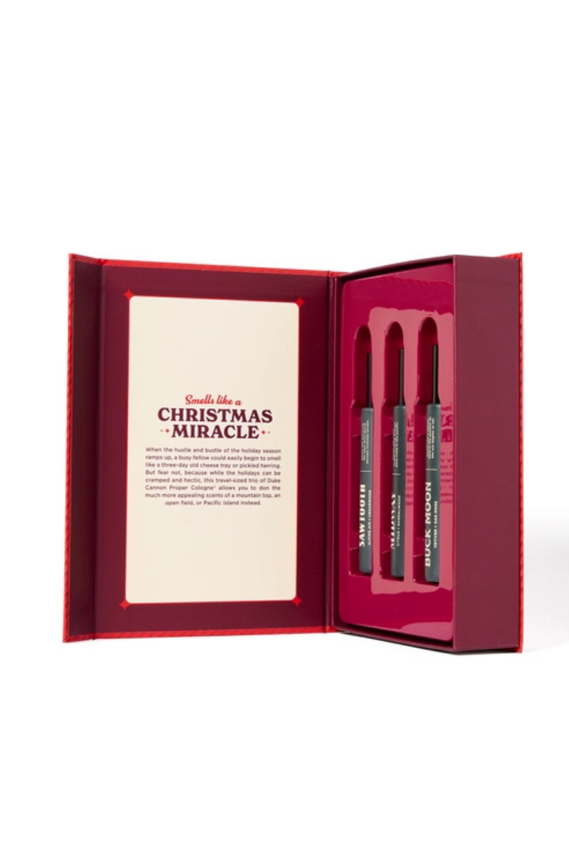 When the hustle and bustle of the holiday season ramps up, a busy fellow could easily begin to smell like a three-day old cheese tray or pickled herring. But fear not: because while the holidays can be cramped and hectic, this convenient, travel-sized trio of Duke Cannon Proper Cologne® allows you to instantly take on the much more appealing scents of an open field, mountain top, or Pacific Island instead.