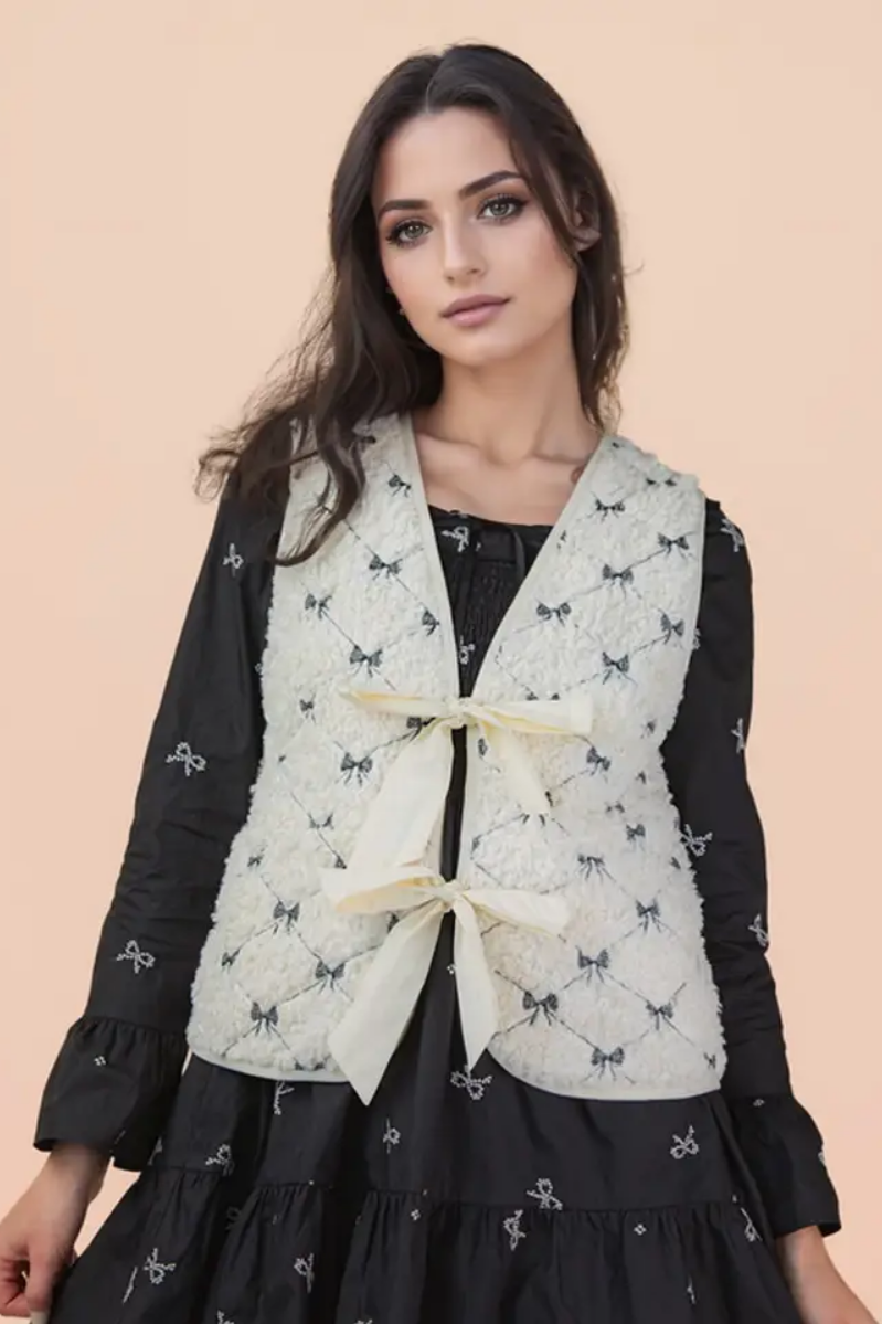 Layer up in the sweetest winter style with our Bow Printed Sherpa Quilt Casual Vest. This ultra-soft sherpa vest features an adorable all-over bow print and a quilted design that keeps you warm without the bulk. Lightweight, cozy, and perfect for everyday outfits, it adds the cutest feminine touch to your cold-weather wardrobe. Ideal for school drop-offs, holiday errands, gifting season, or just staying cozy on the go β this vest is pure comfy-cute perfection.