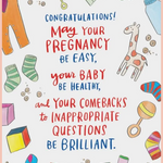 What is it about having a pregnant body that signals to everyone-- from Steve in accounting to the cashier at 7-Eleven -- that it's open season on invasive lines of questioning? This card can't stop the questions (if it could, I would be retired on a tropical island) but it can send good vibes for shutting them down in a brilliant manner.