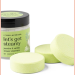 Indulge in quick relaxation with our SHOWER BOMBS. Packed with two essential oils, these in-shower steamers are perfect for busy days. With 3 individually wrapped steamers in each jar, choose from jasmine & vanilla, lavender & chamomile, or lemongrass & citrus scents. Handmade in the USA, these natural ingredients create a spa-like experience.