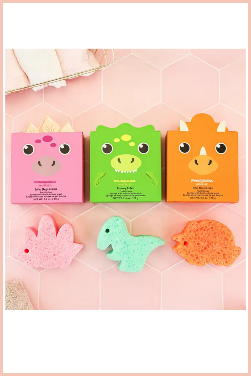 Turn bath time into a fun and educational experience with Spongellé®'s Spongeasaurus Collection. Featuring Tommy T-Rex, Tina Triceratops, and Sally Stegosaurus sponges with fruity scents that will make cleaning a joy for your little one. Packaged in unique gift boxes, these prehistoric creatures will spark their imagination!
