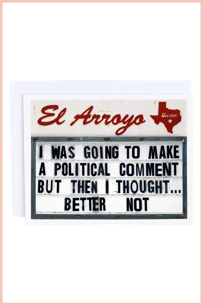 Featuring the El Arroyo Marquee Sign: "I was going to make a political comment and thought better not." These cards have a plush, velvety exterior and are blank on the inside for your own message. Each card comes with an envelope in a cellophane bag. Card size: 5.5"w x 4.25"h.