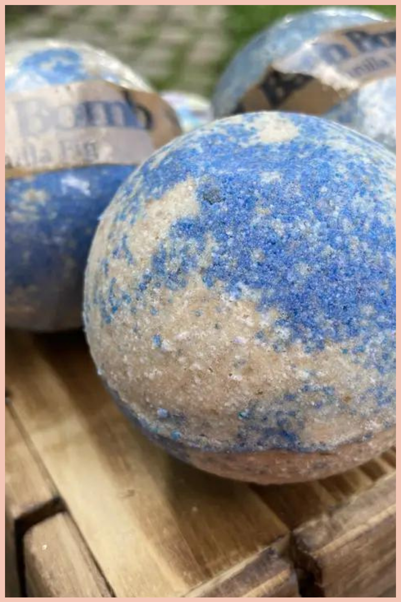 Ingredients: baking soda, citric acid, corn starch, goat milk powder, epsom salts, colloidal oatmeal, cocoa butter, polysorbate 80 (emulsifier), fragrance oil, bath bomb colorant.