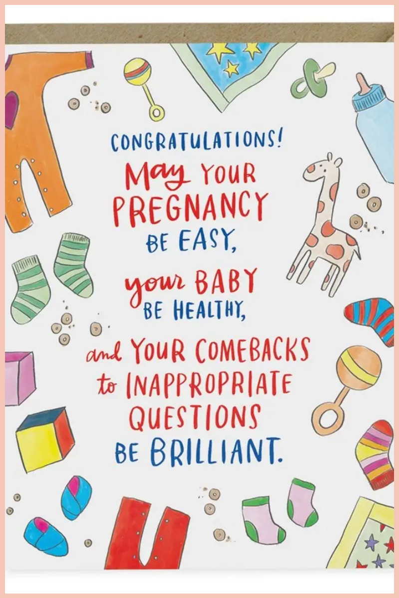 What is it about having a pregnant body that signals to everyone-- from Steve in accounting to the cashier at 7-Eleven -- that it's open season on invasive lines of questioning? This card can't stop the questions (if it could, I would be retired on a tropical island) but it can send good vibes for shutting them down in a brilliant manner.
