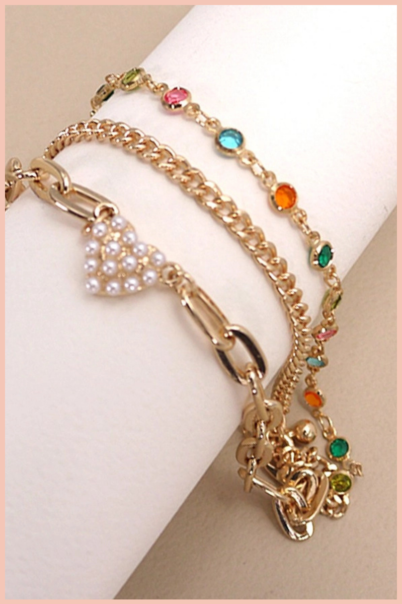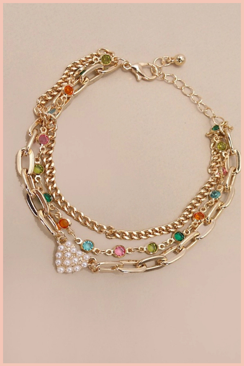Add some love to your jewelry collection with our Pearl Heart Layer Bracelet! Featuring multiple layers adorned with lustrous pearls and heart-shaped charms, this playful and fun design will catch everyone's eye. With colorful stones, this bracelet is the perfect accessory for any outfit.