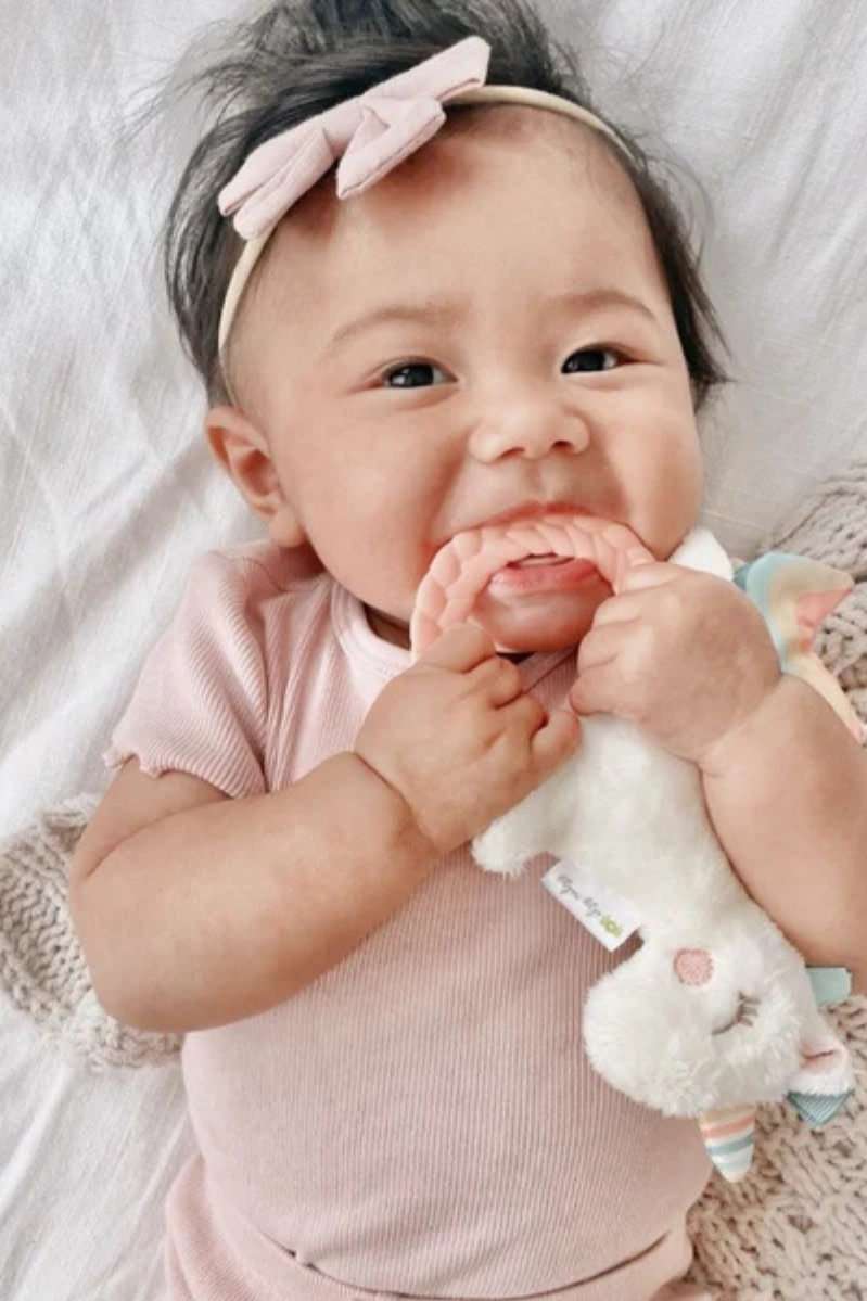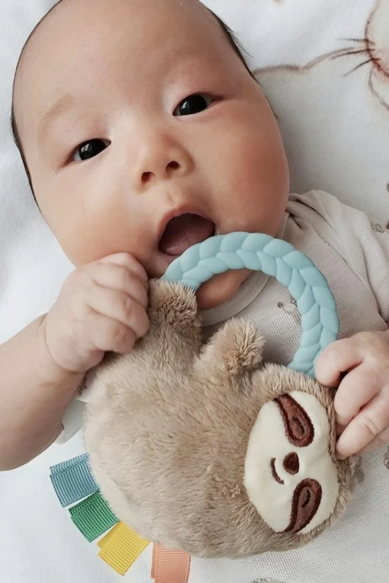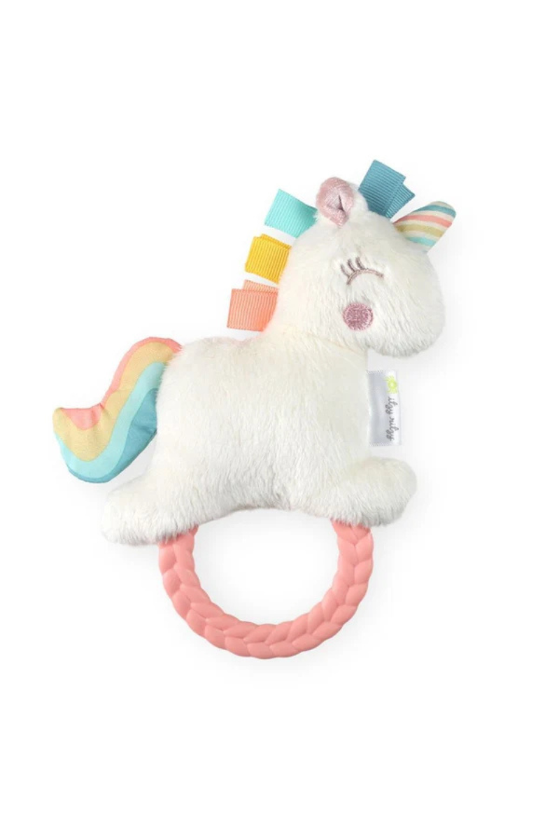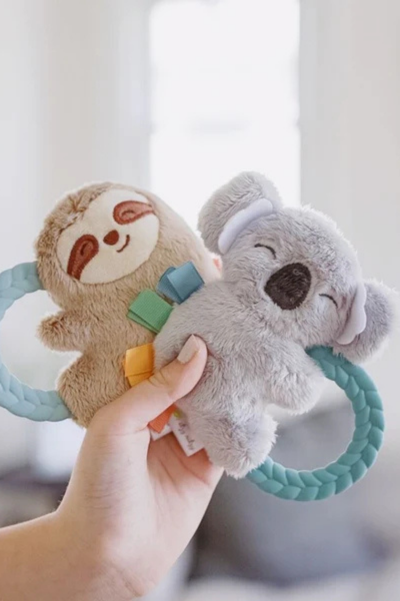 The Ritzy Rattle Pal™ is your babe's new bestie, doubling as a plush rattle and braided teething toy to soothe sore gums. With a gentle rattle sound and colorful textured ribbons, this playful baby rattle keeps your little one entertained and comforted. Whether in the stroller or car seat, the Ritzy Rattle Pal™ makes a perfect travel toy! Choose from a variety of stuffed animal characters, including a unicorn, sloth, and koala, or the adorable rainbow option.