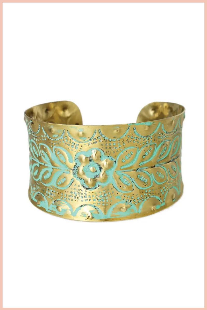 Elevate your style with our Sonora Style Patina Flower Cuff Bracelet. This playful piece features a stunning patina flower design that adds a touch of fun to any outfit. Made with high-quality materials, it is sure to become your go-to accessory for any occasion.