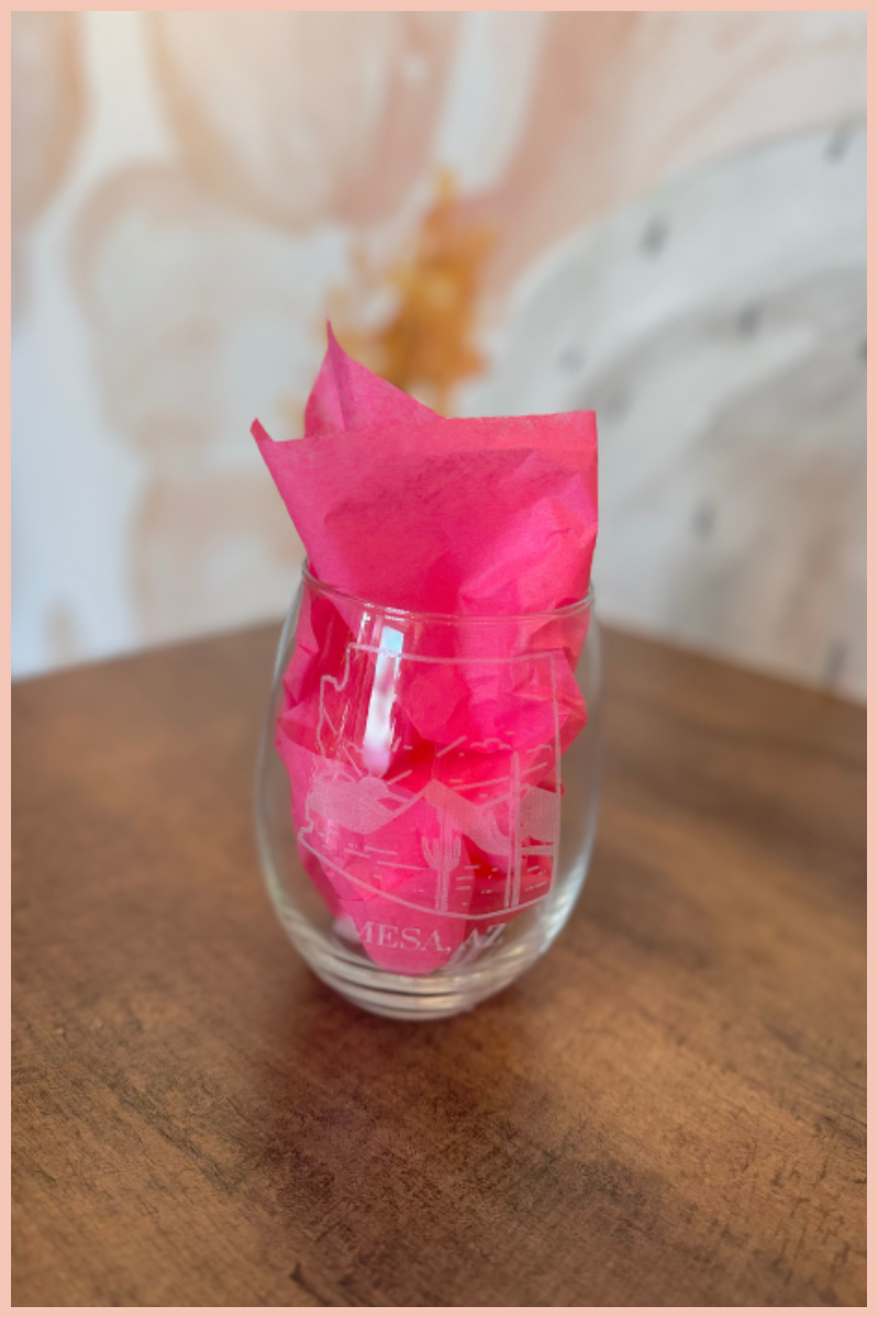 Sip in style with our STEMLESS WINE GLASS featuring a stunning laser-engraved MESA, ARIZONA . This 20.5 oz glass is both beautiful and sturdy, making it the perfect addition to your home bar. Cheers to unforgettable views and great wine!