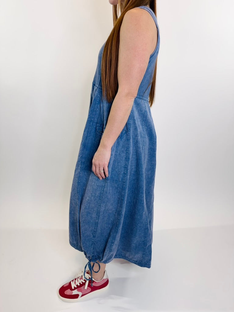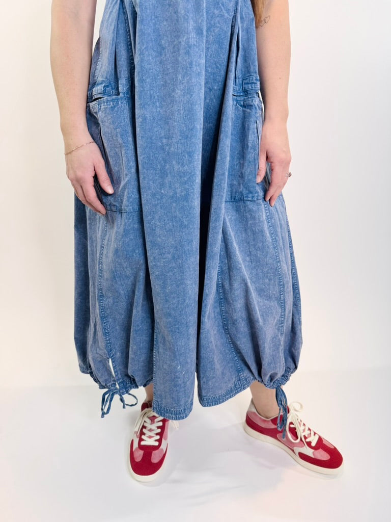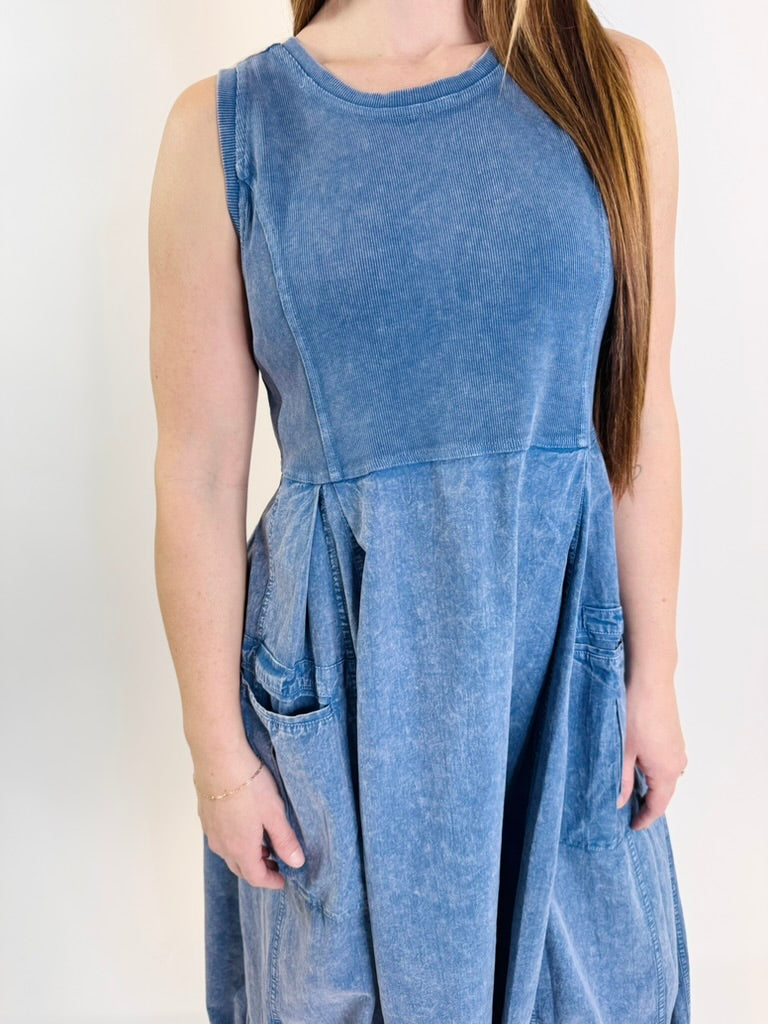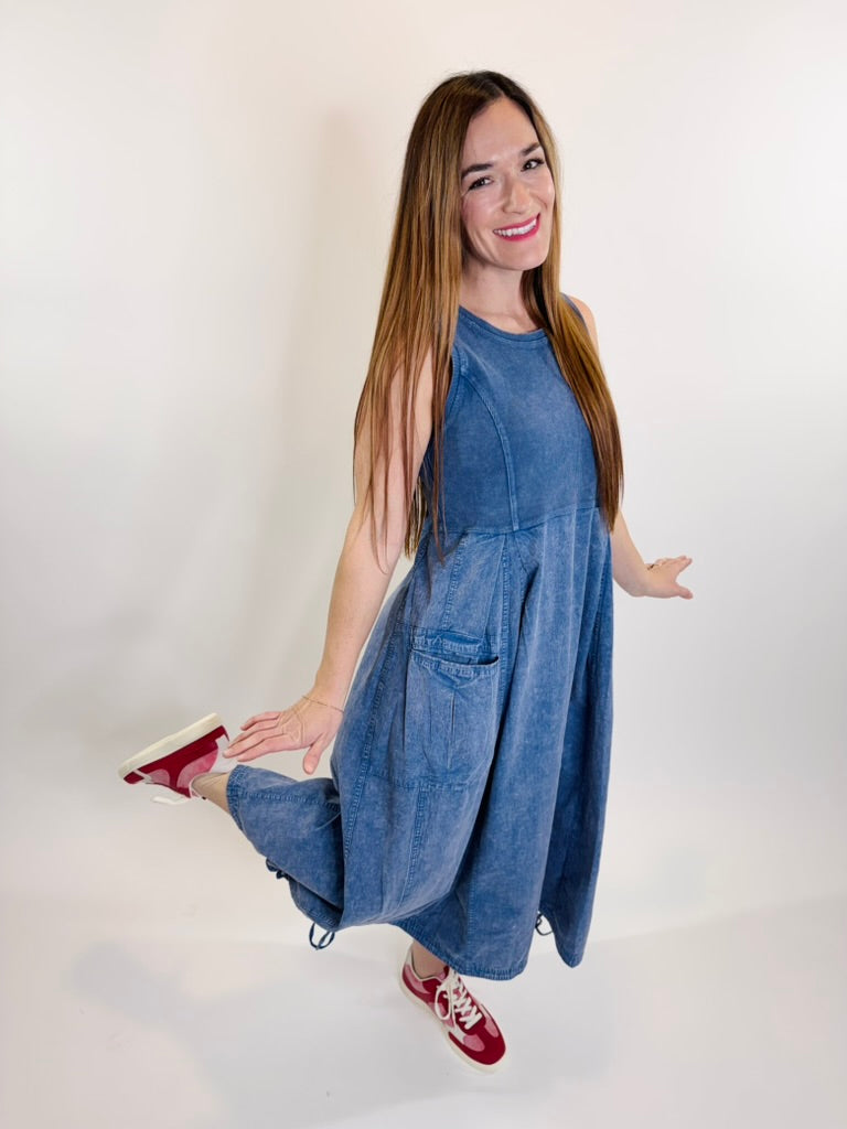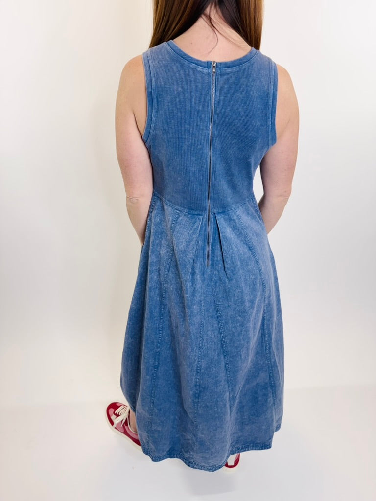 Utility meets effortless cool in this Mineral Washed Rib Knit Cargo Midi Dress. Designed with a mixed rib knit and woven texture, it gives you structure and softness all in one. The relaxed silhouette, cargo pockets, and adjustable cinch hem create that laid-back, styled-without-trying vibe — while the back zip keeps the fit clean and flattering.