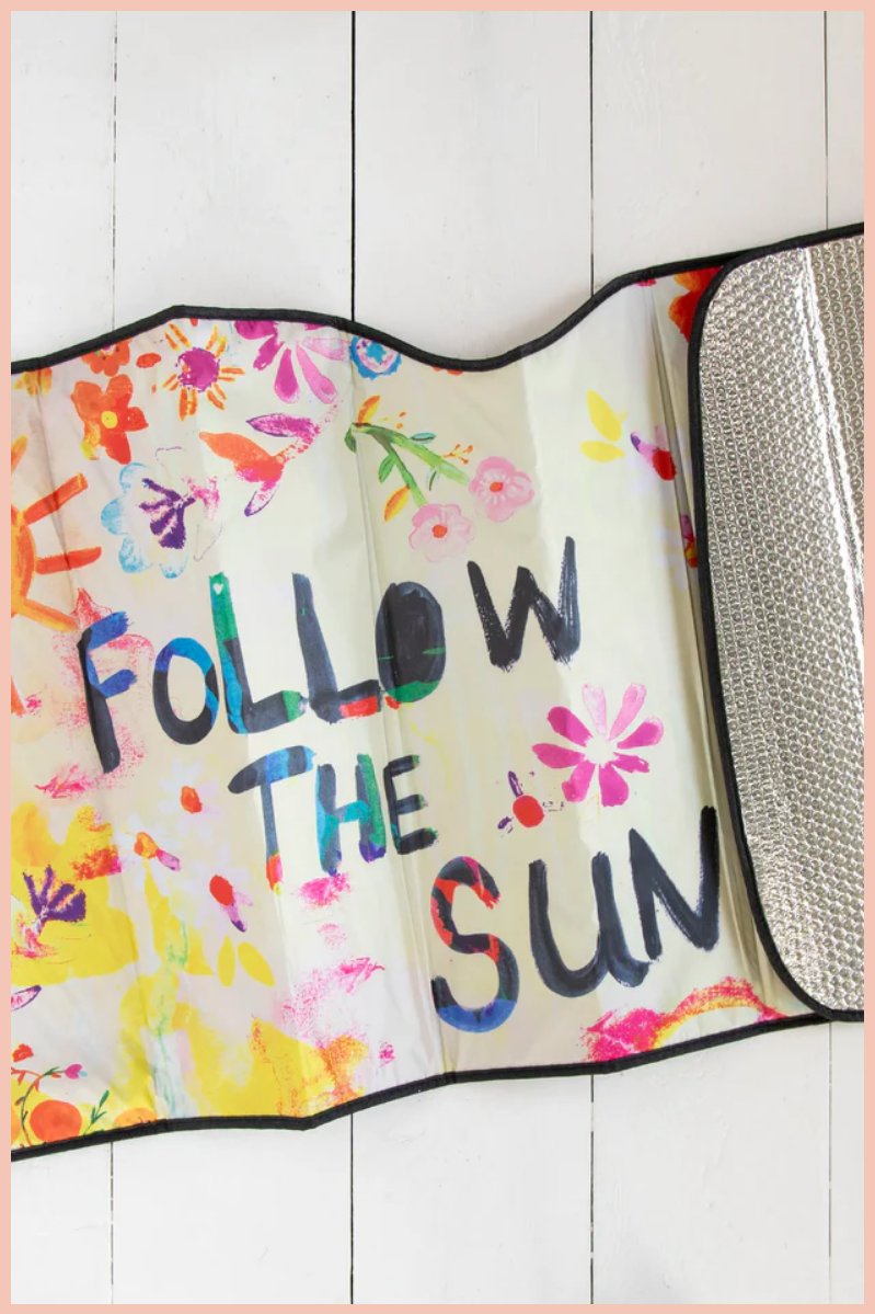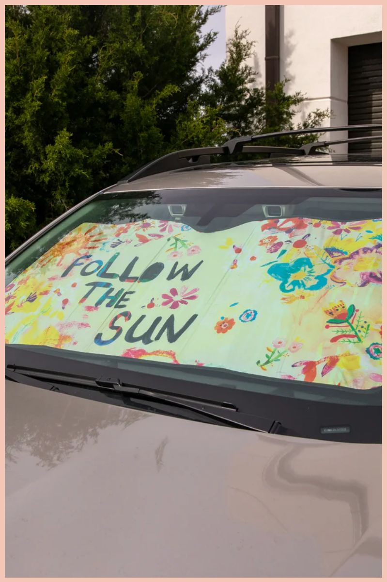 Add this colorful and useful sun shade to your car to protect its interior from the sun & heat! We love this car accessory that has a cute Life Is A Canvas design with the message, "Follow The Sun" that will brighten up any day! This Life Is A Canvas sun shade is slightly smaller, making it great for compact cars! Plus, its accordion fold makes it easy to store when its not in use!