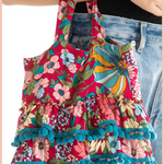 This Mini Ruffle Tote Bag is perfect for brunch with friends or a lunch date! Use it to hold your essentials like your phone, wallet and keys, and extras like a pair of sunglasses, lip balm and small notebook. The blue-red floral print and contrasting pom poms will bring a boho vibe to your look!