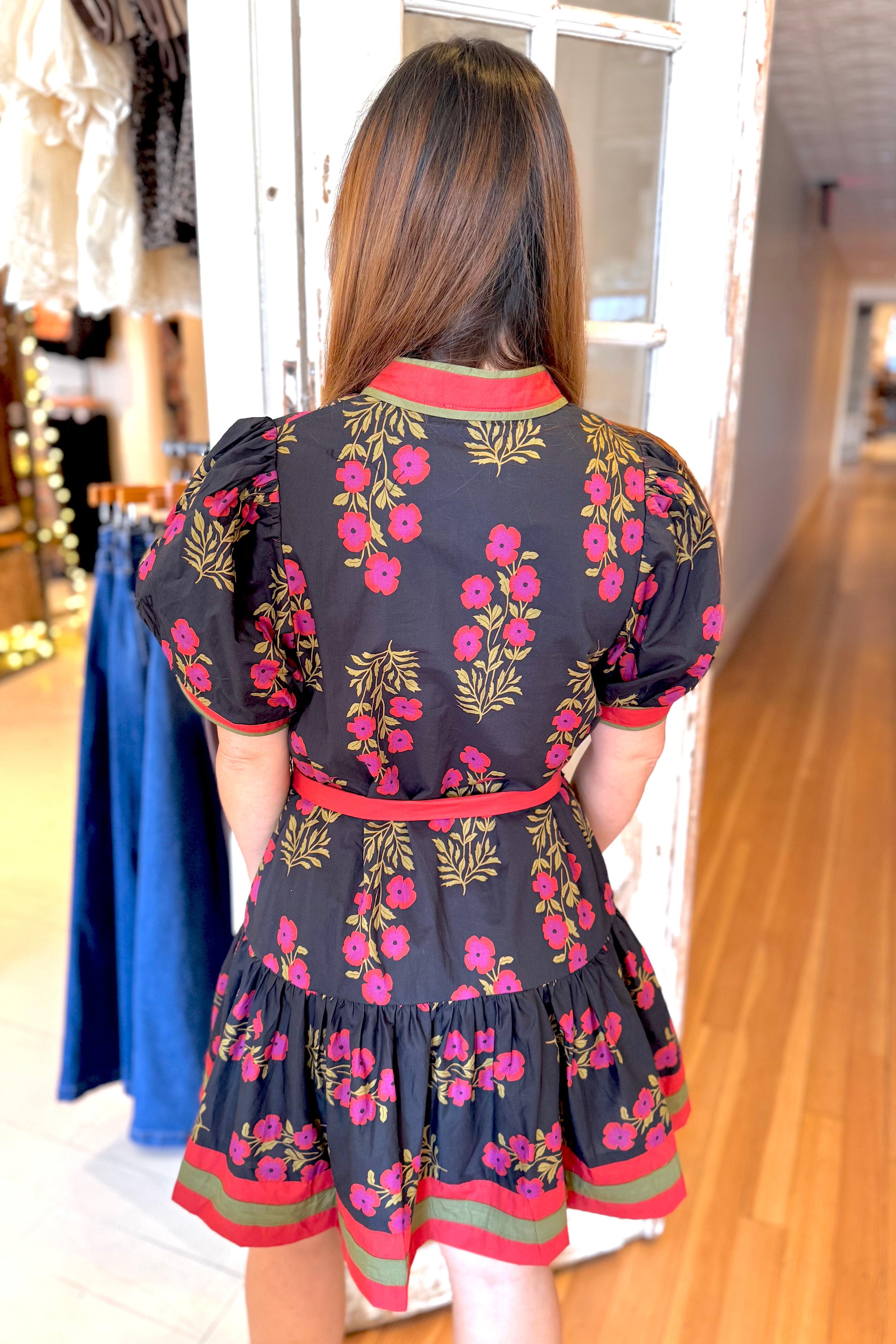 This playful mini dress combines a floral pattern with charming puff sleeves and a flirty ruffle hem. The multicolor accent band adds a pop of fun, while the V-neck and band collar with button closure create a cute, polished look. Lightweight and woven with a non-sheer lining, it offers both comfort and coverage. Extras like a removable belt and handy side pockets make it as practical as it is pretty—perfect for twirling through sunny days.