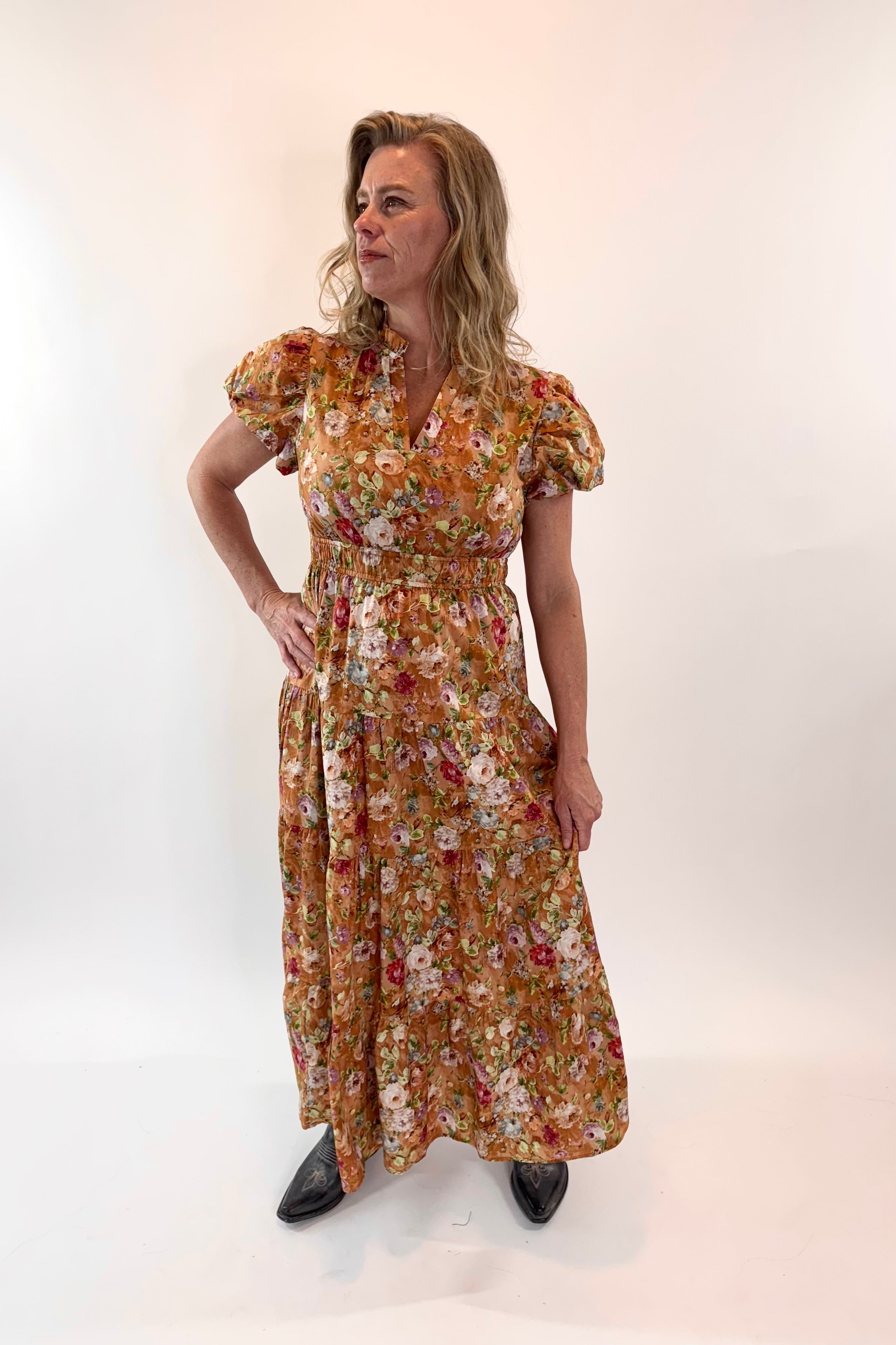 The Rust In Bloom Floral Maxi Dress showcases a delicate floral print with short bubble puff sleeves and a flowing tiered maxi silhouette. Featuring a double elasticated waist, this pullover dress offers a tailored yet comfortable fit. Crafted from lightweight, woven fabric that is fully lined and non-sheer, it ensures both elegance and practicality for all-day wear.