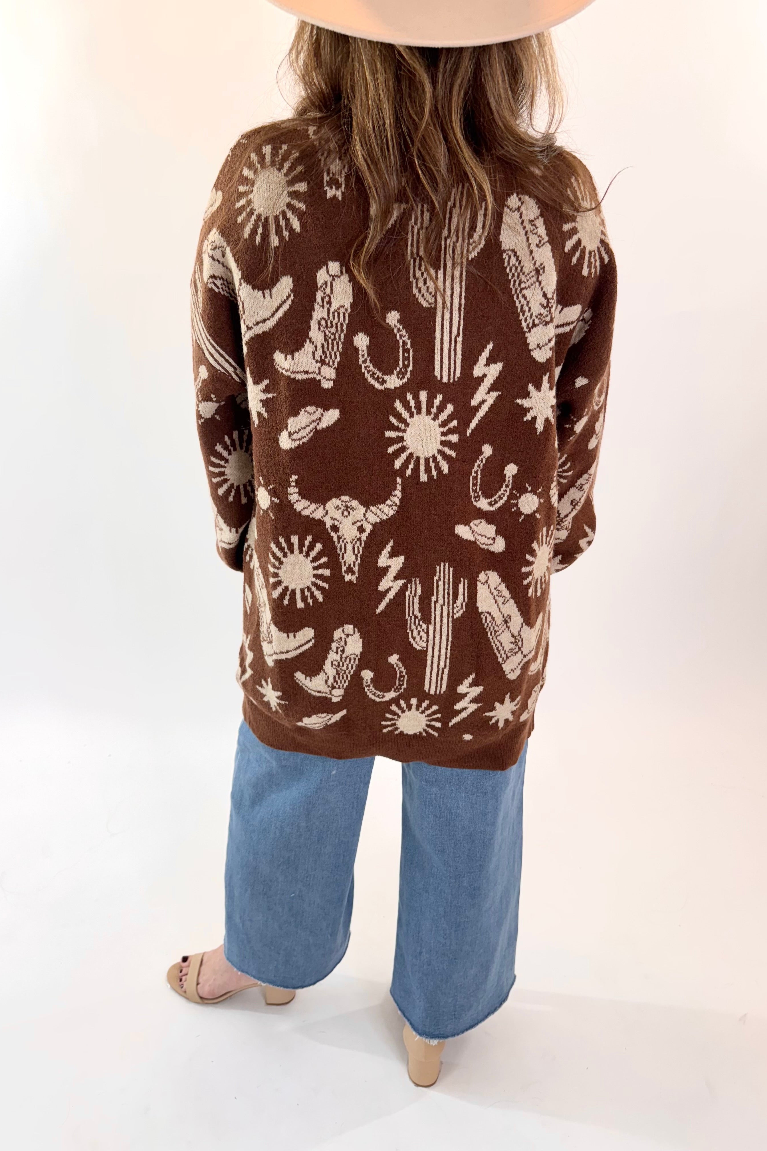 Stay cozy and stylish with this Oversized Western Graphic Knit Sweater Cardigan. Featuring a relaxed drop shoulder fit, long sleeves, and an easy open front, it’s perfect for layering. The tunic length adds extra coverage, while front pockets keep your essentials close or hands warm. Embrace laid-back vibes with a playful Western flair that’s as comfy as it is cool.