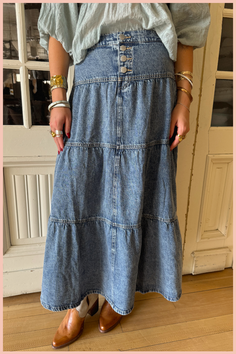 Show off your playful side with our High Rise Ruffled Denim Skirt! This unique skirt features a high rise waist and cascading ruffles that add a touch of whimsy to your outfit. Made from durable denim, this skirt is perfect for any occasion. (No frumps here!)