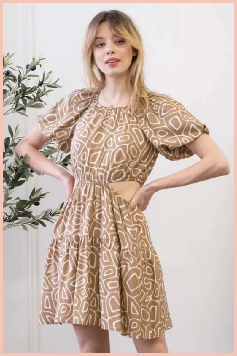 Wrap yourself in style and confidence with our Side Cut Out Midi Dress! The U neckline, bubble sleeves, and tiered skirt enhance your curves, while the behind-the-neck button closure and cut out waist add a touch of allure. The elasticized waist and lining ensure a comfortable and flattering fit. Perfect for any occasion, this dress will make you feel empowered and chic.