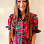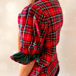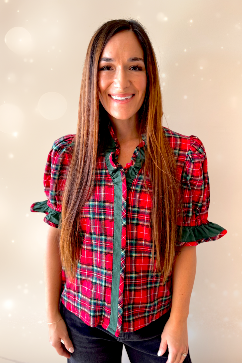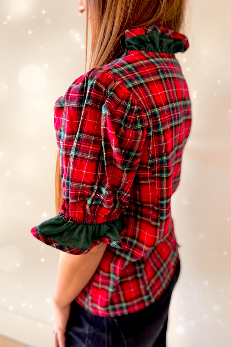 Plaid Puff Sleeve Top + Contrast Ruffle Trim