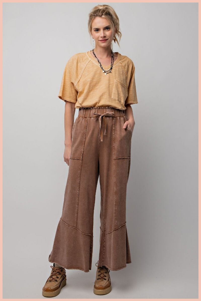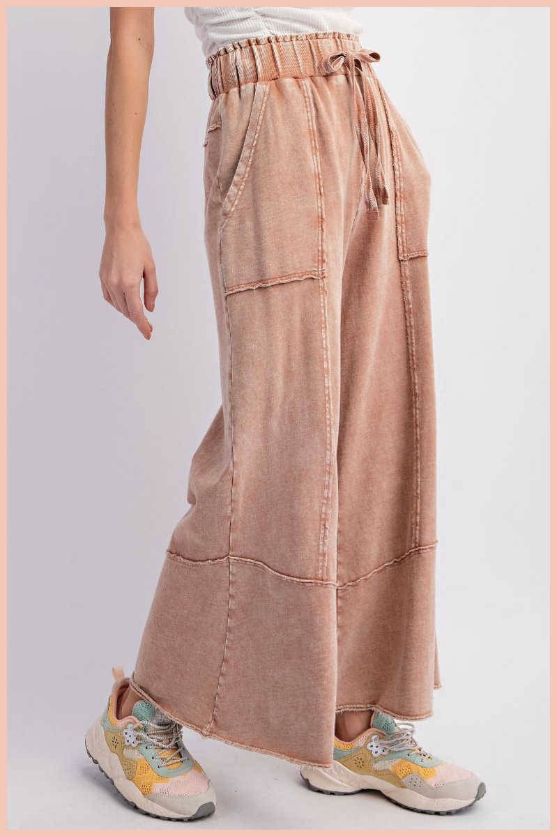 Get comfy and stylish with our Mineral Washed Terry Knit Pants! Made with a mineral washed fabric, these pants are soft, breathable, and effortlessly cool. Perfect for lounging or running errands, they'll quickly become your go-to choice for ultimate comfort and style. So go ahead, rock that laid-back look!