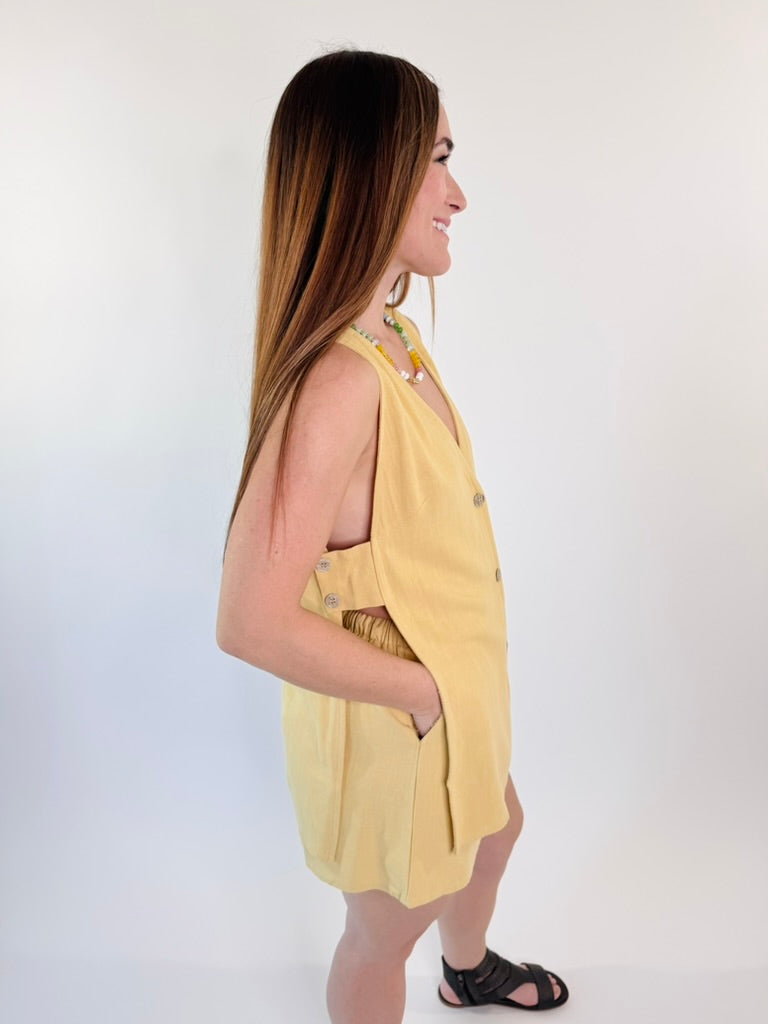 Effortless and elevated, the Sunlit Stroll Linen Button Vest Top is the perfect warm-weather staple for chic matching moments. Designed with a flattering V-neckline and a polished button-down front, this sleeveless linen top brings modern sophistication with a relaxed feel.