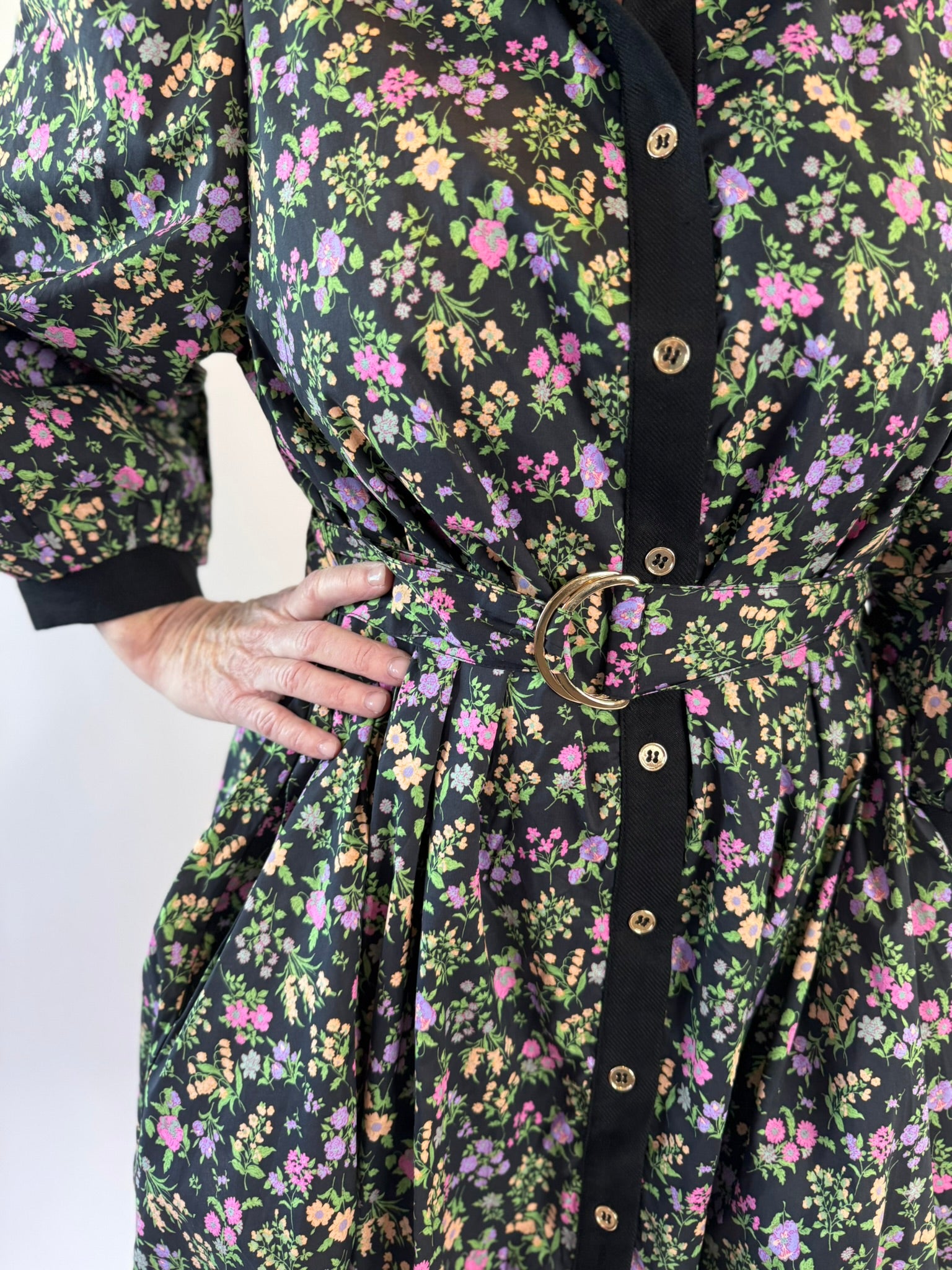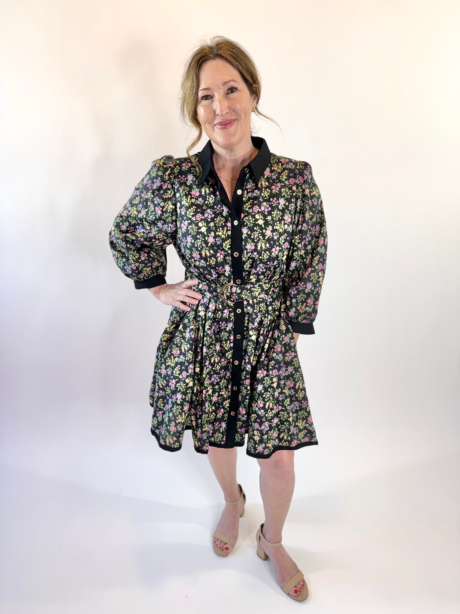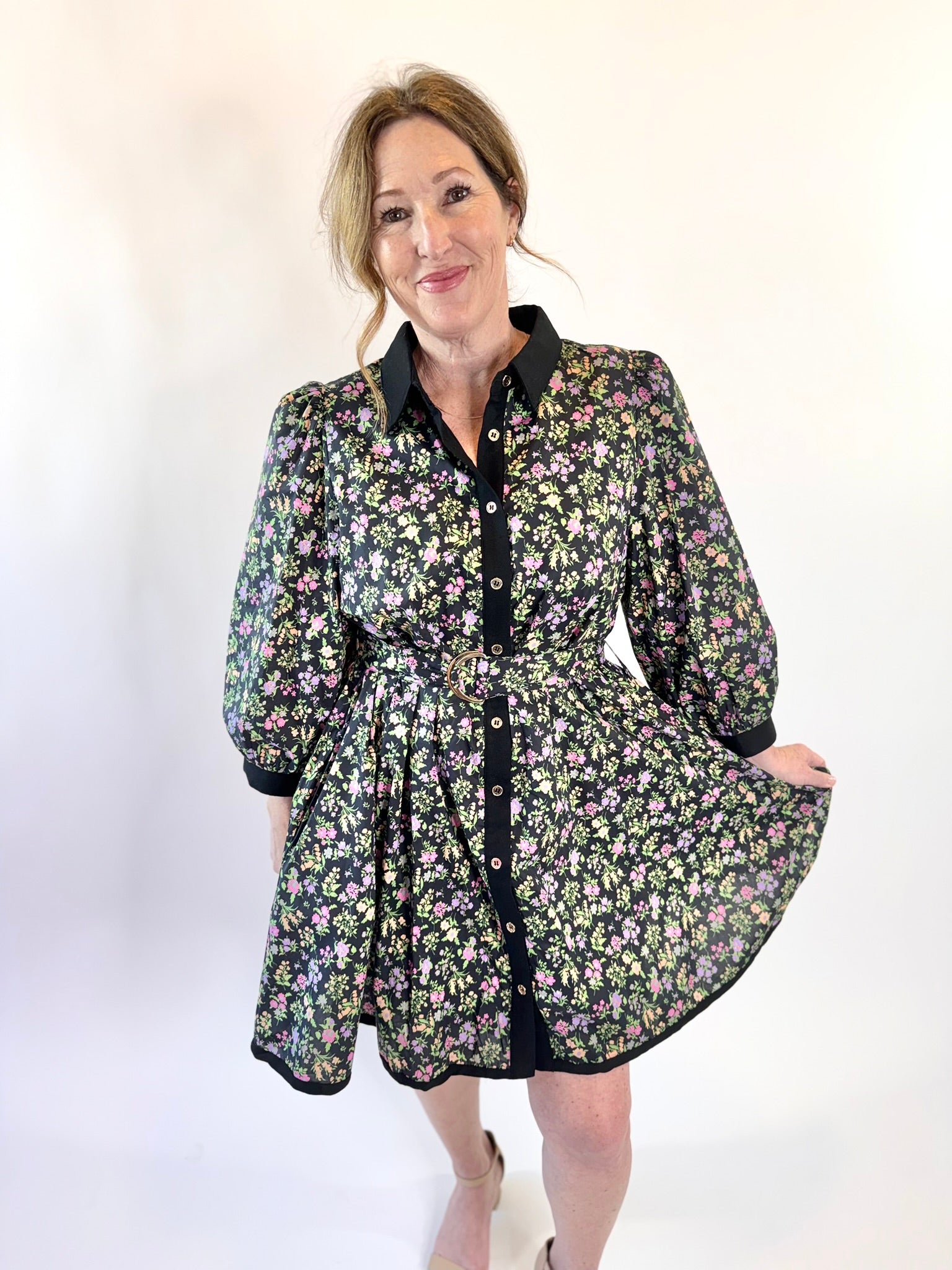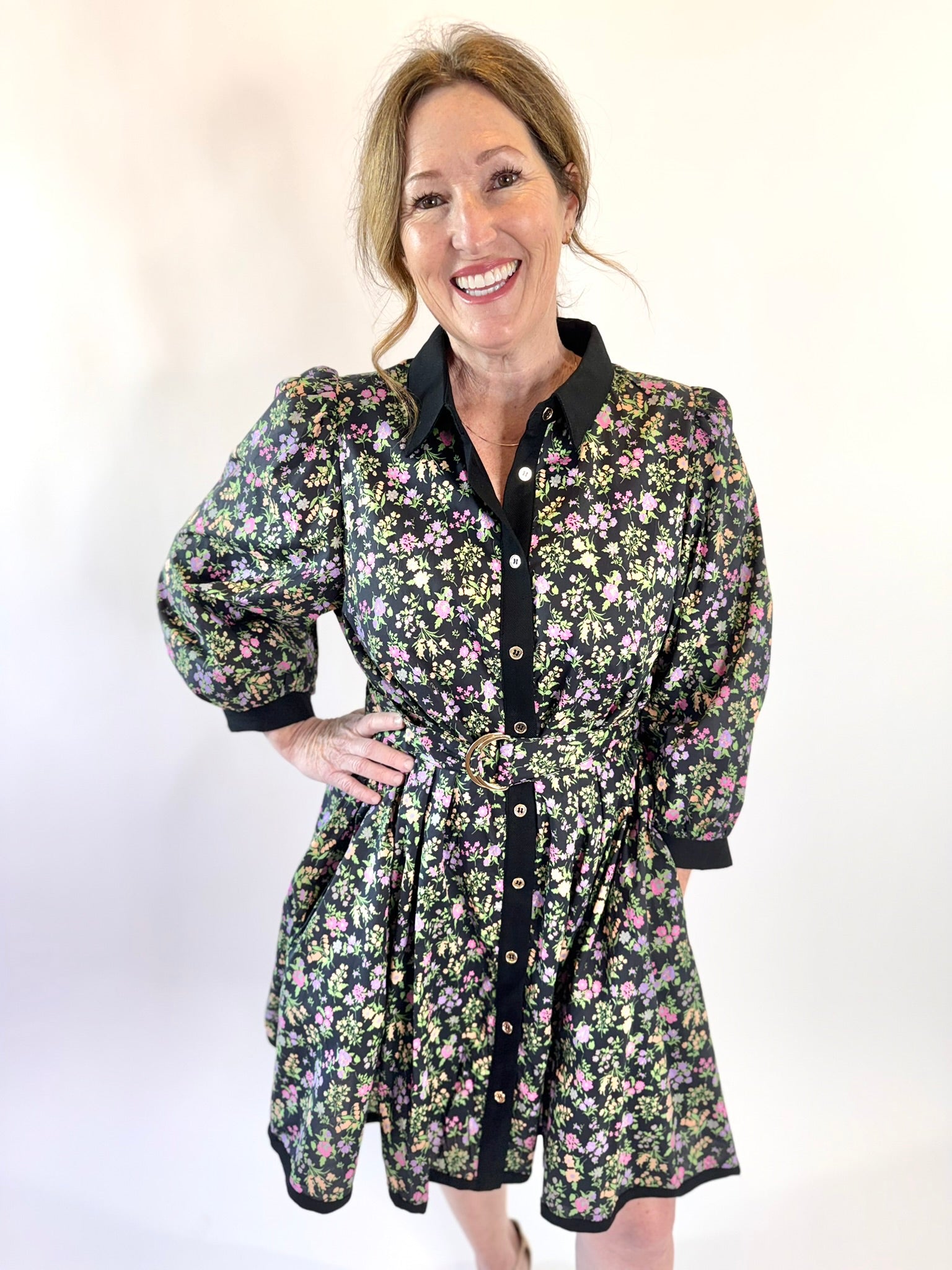 Say hello to your new favorite throw-on-and-wow dress. This floral print mini is equal parts sweet and sophisticated, featuring a button front design, flattering 3/4 sleeves, and a waist-cinching belt with a chic buckle detail.