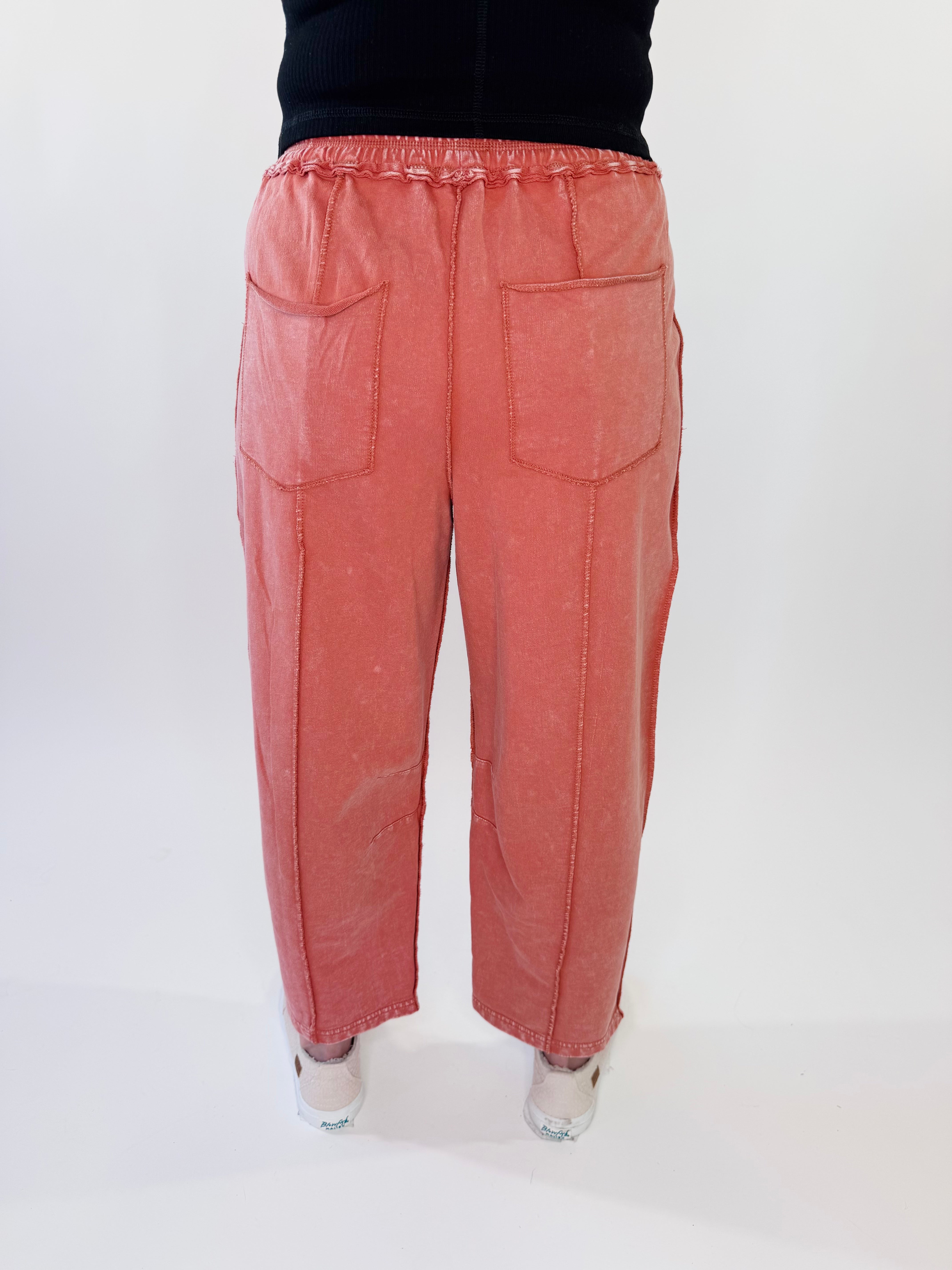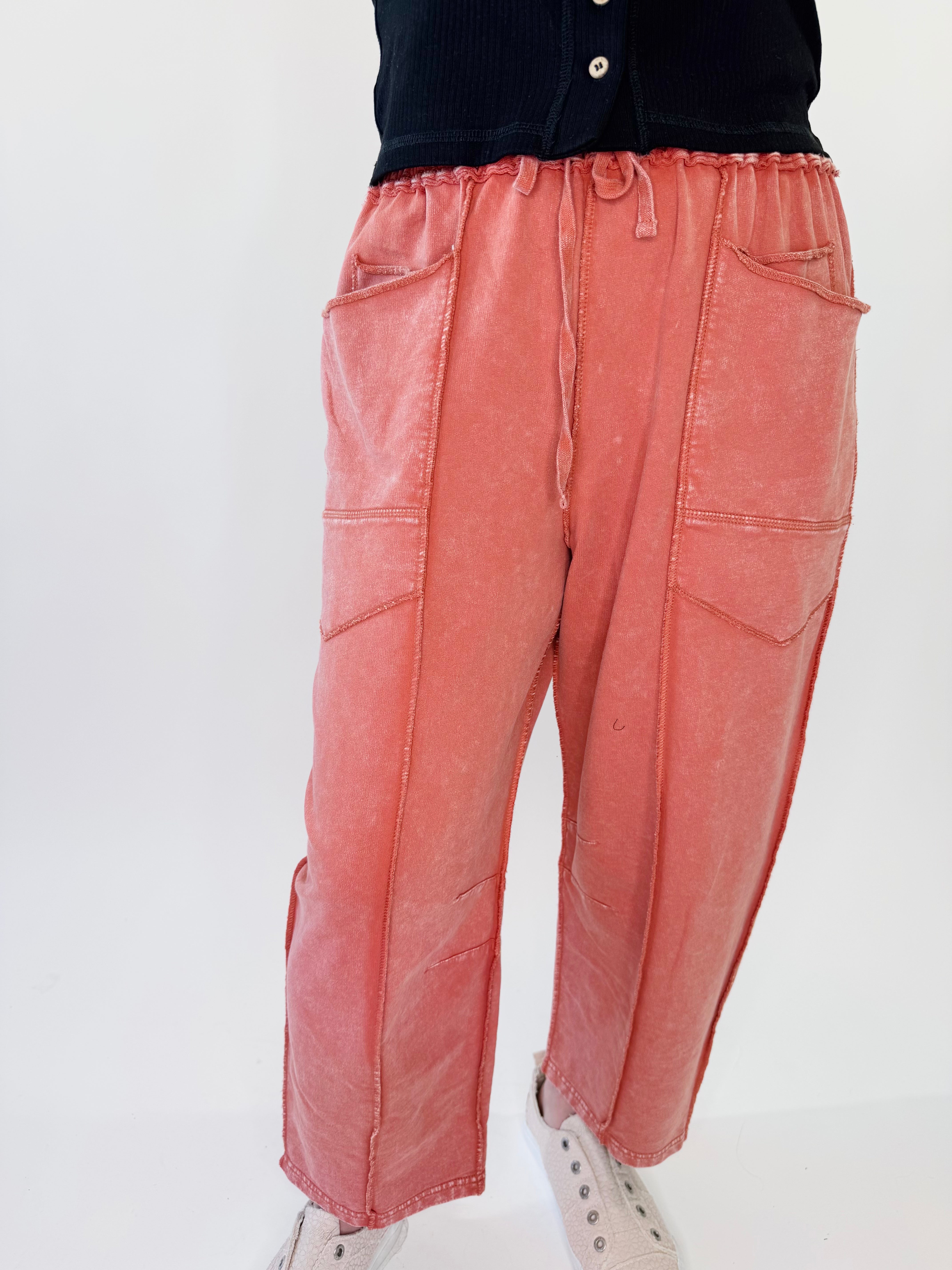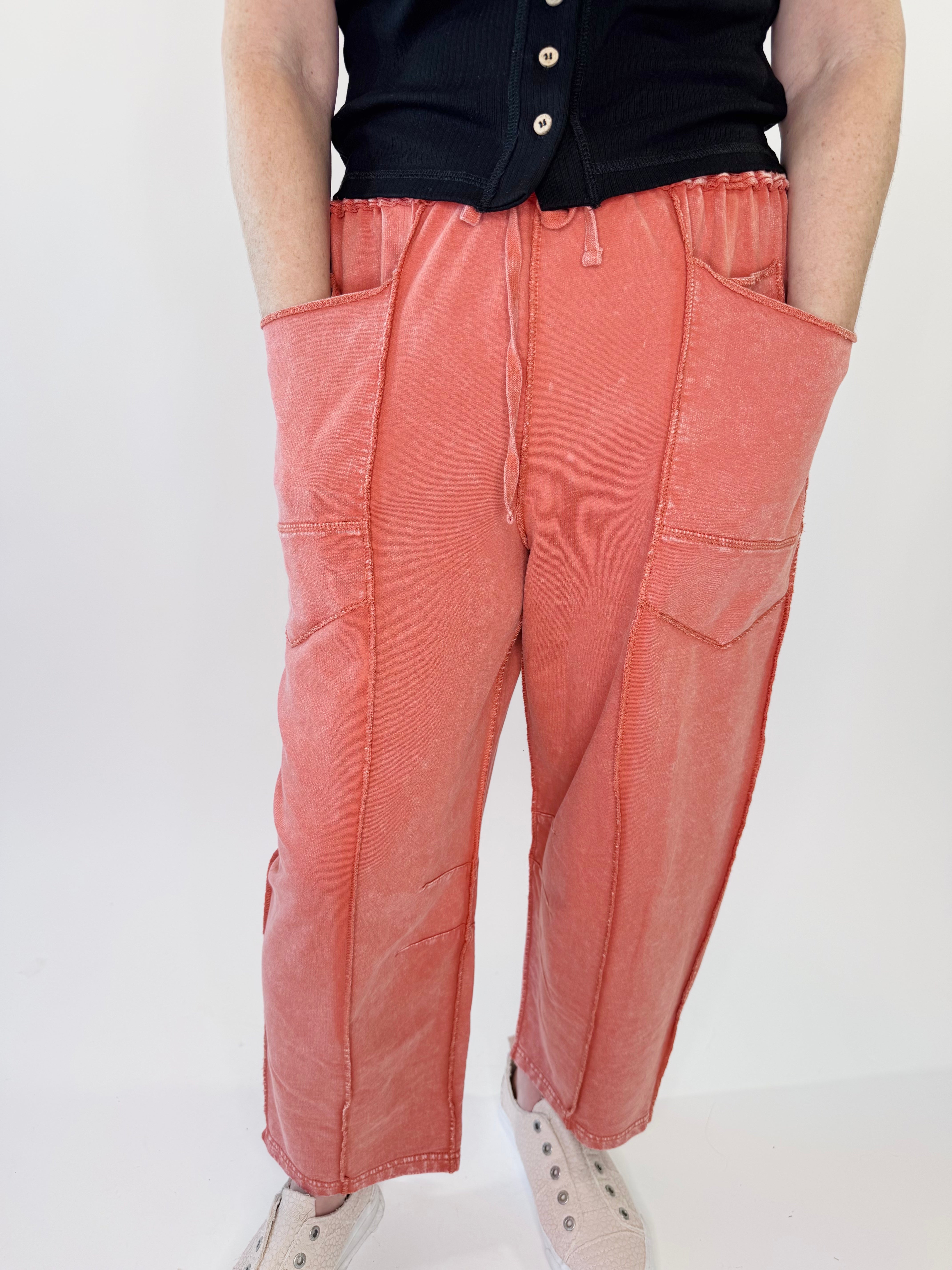 If comfort is queen, these pants wear the crown. Designed in a soft mineral washed terry knit, they bring that effortless, lived-in feel with a relaxed wide leg silhouette that moves beautifully. The cargo-inspired details and exposed seaming add just the right amount of edge, making them easy to dress up or down.