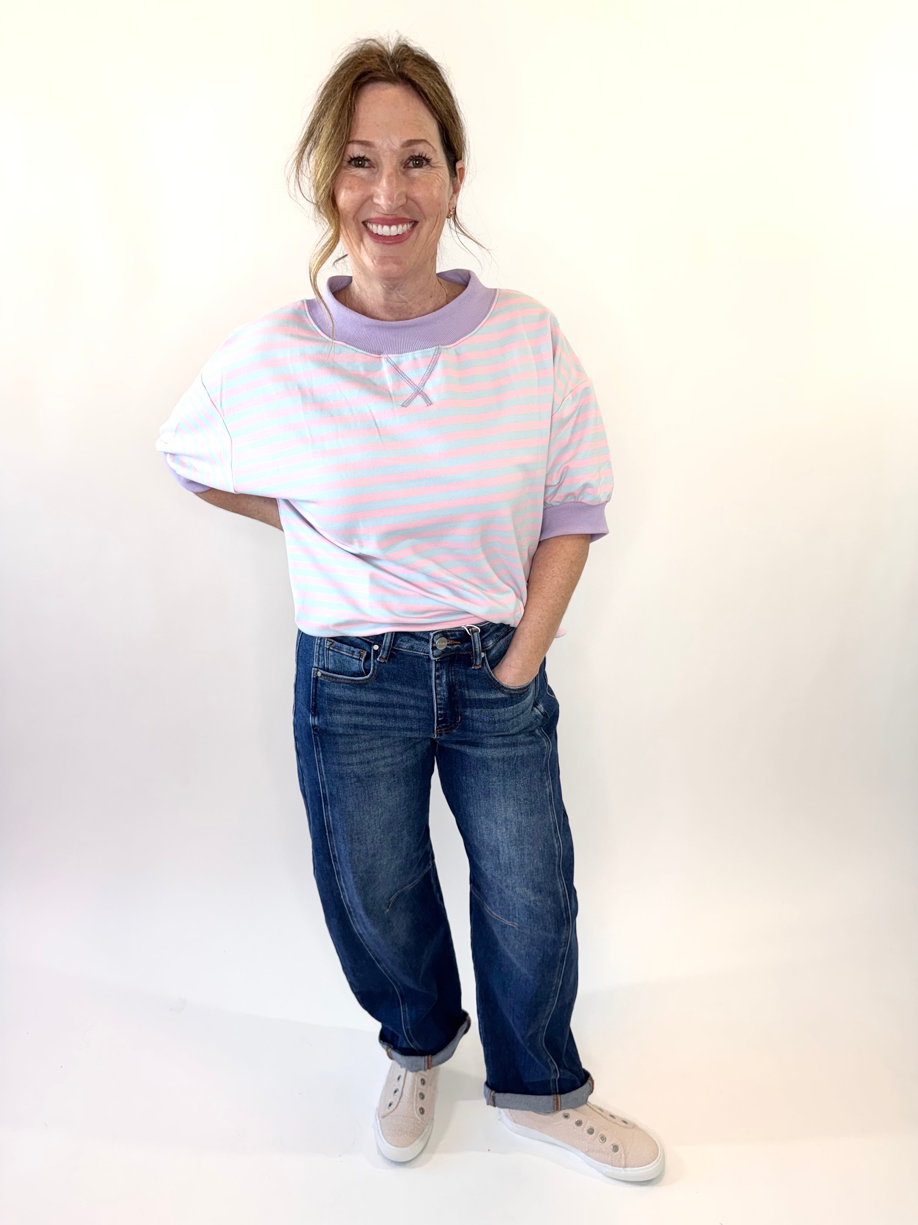 The ultimate lightweight lounge layer is here — and yes, you can absolutely wear this even when it’s warm out. This mock neck striped sweatshirt features airy 3/4 sleeves and a relaxed fit that gives you that cozy vibe without the heavy, sweaty feel.