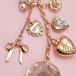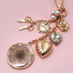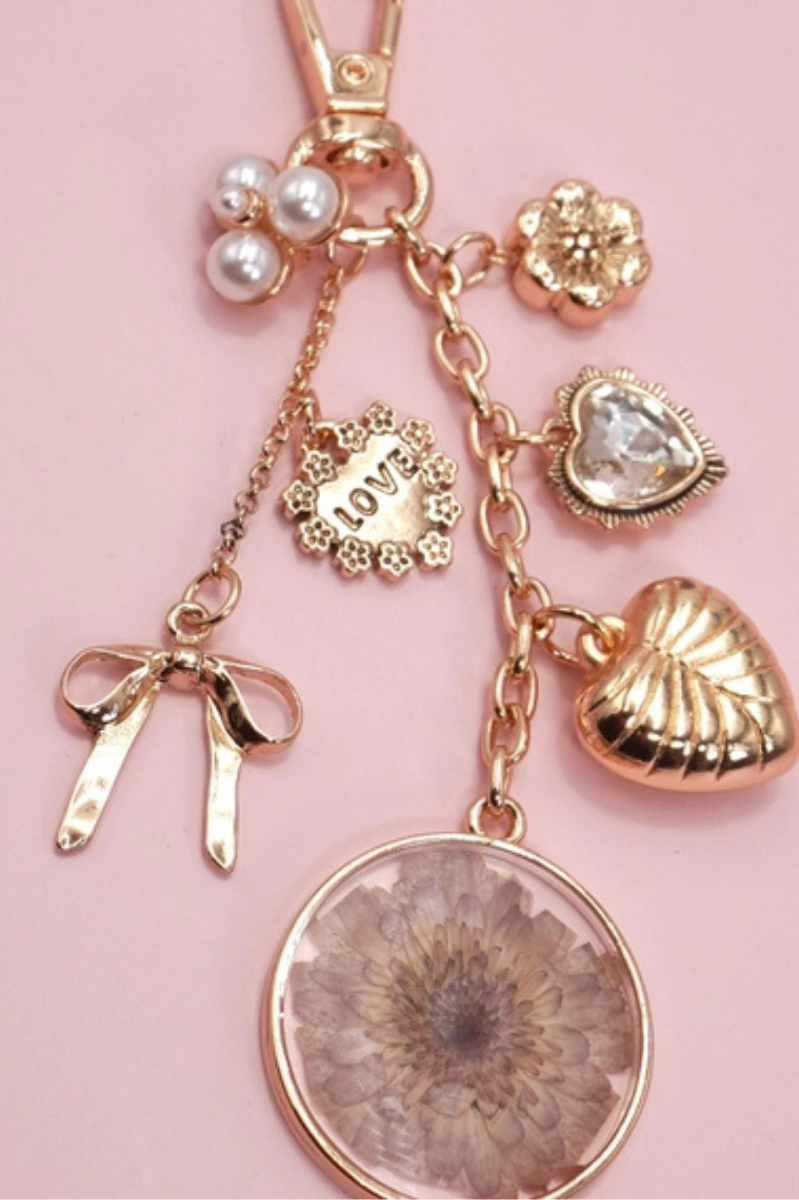 Dried flower bag charm with bow, heart, and pearl floral details. Gold-plated, durable, and perfect for purses, backpacks, or keychains. The perfect little “thinking of you” gift 💕
