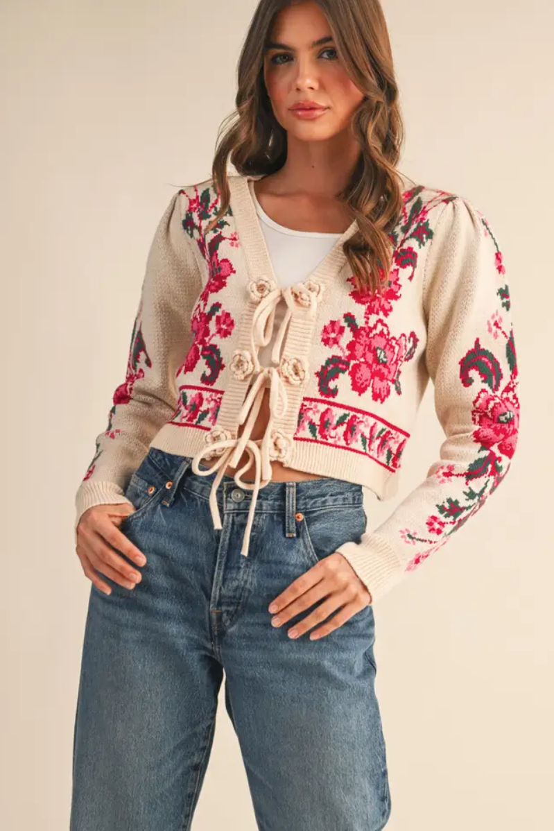 Floral Knit Tie-Front Cropped Sweater Cardigan