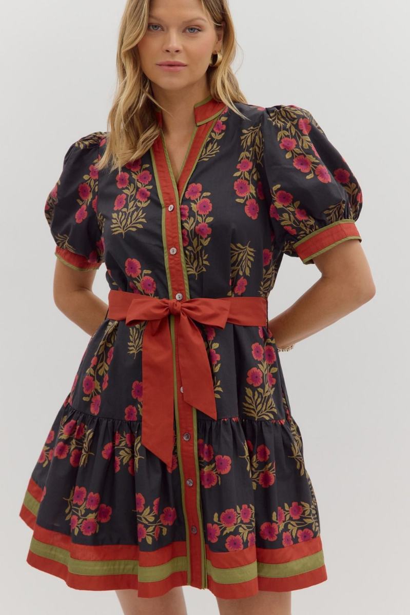 This playful mini dress combines a floral pattern with charming puff sleeves and a flirty ruffle hem. The multicolor accent band adds a pop of fun, while the V-neck and band collar with button closure create a cute, polished look. Lightweight and woven with a non-sheer lining, it offers both comfort and coverage. Extras like a removable belt and handy side pockets make it as practical as it is pretty—perfect for twirling through sunny days.