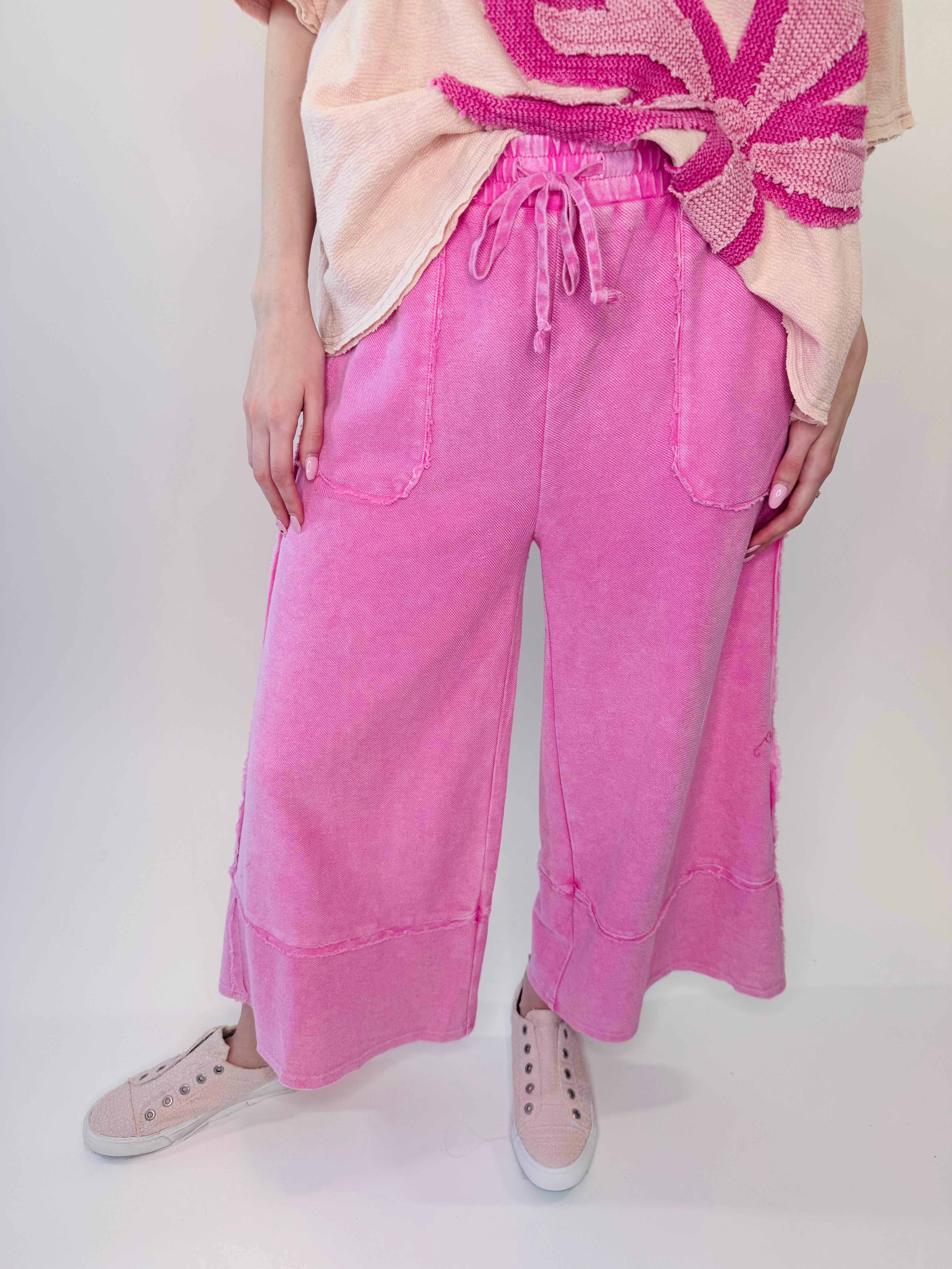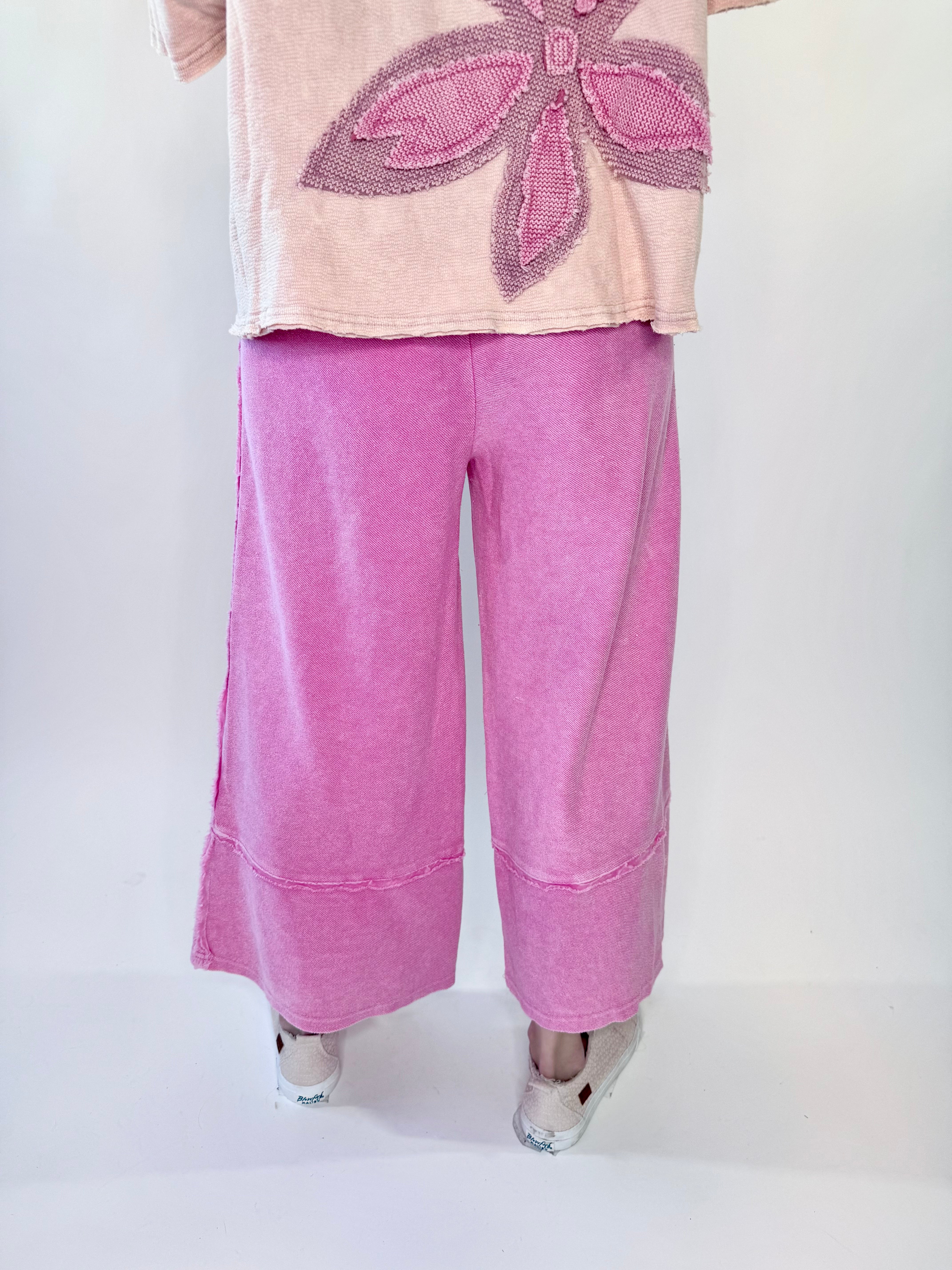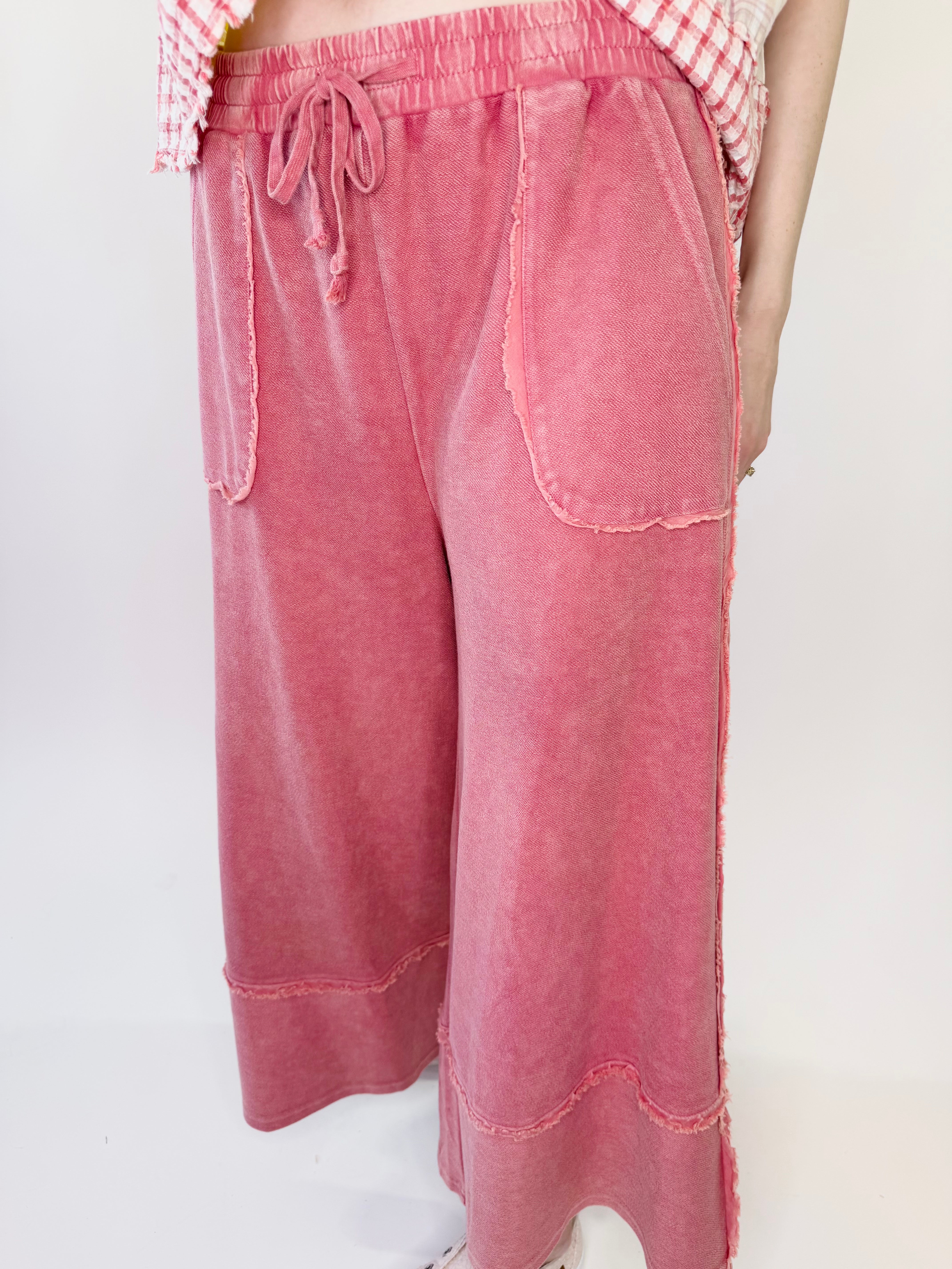 Laid-back comfort meets your every day effortless style in these mineral washed terry palazzo pants. Designed with a relaxed wide leg silhouette and soft knit feel, they deliver all-day comfort with a touch of lived-in charm. The elastic waistband and adjustable drawstring offer a flexible fit, while raw cut and frayed seam detailing add that perfectly undone finish.