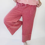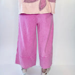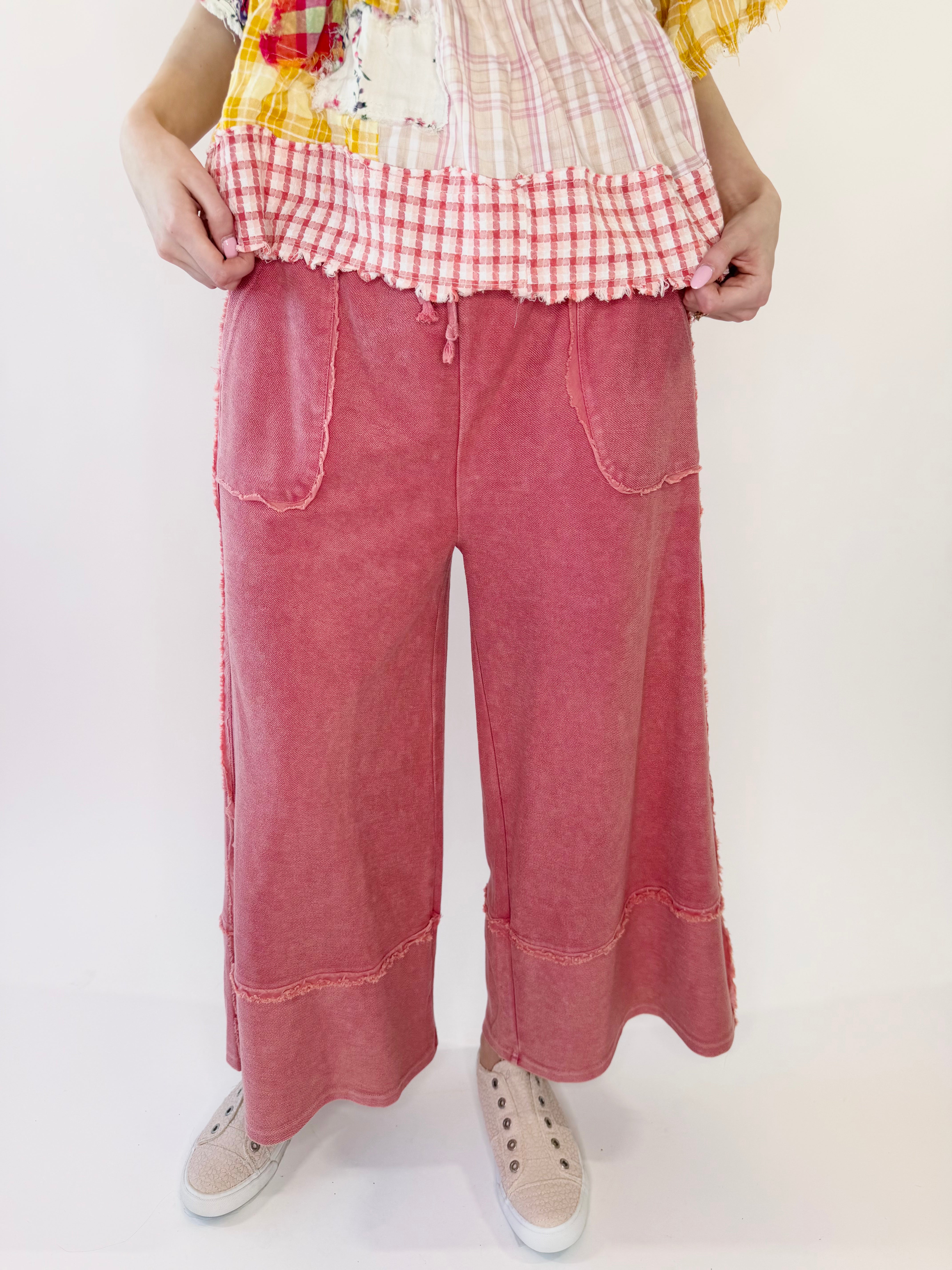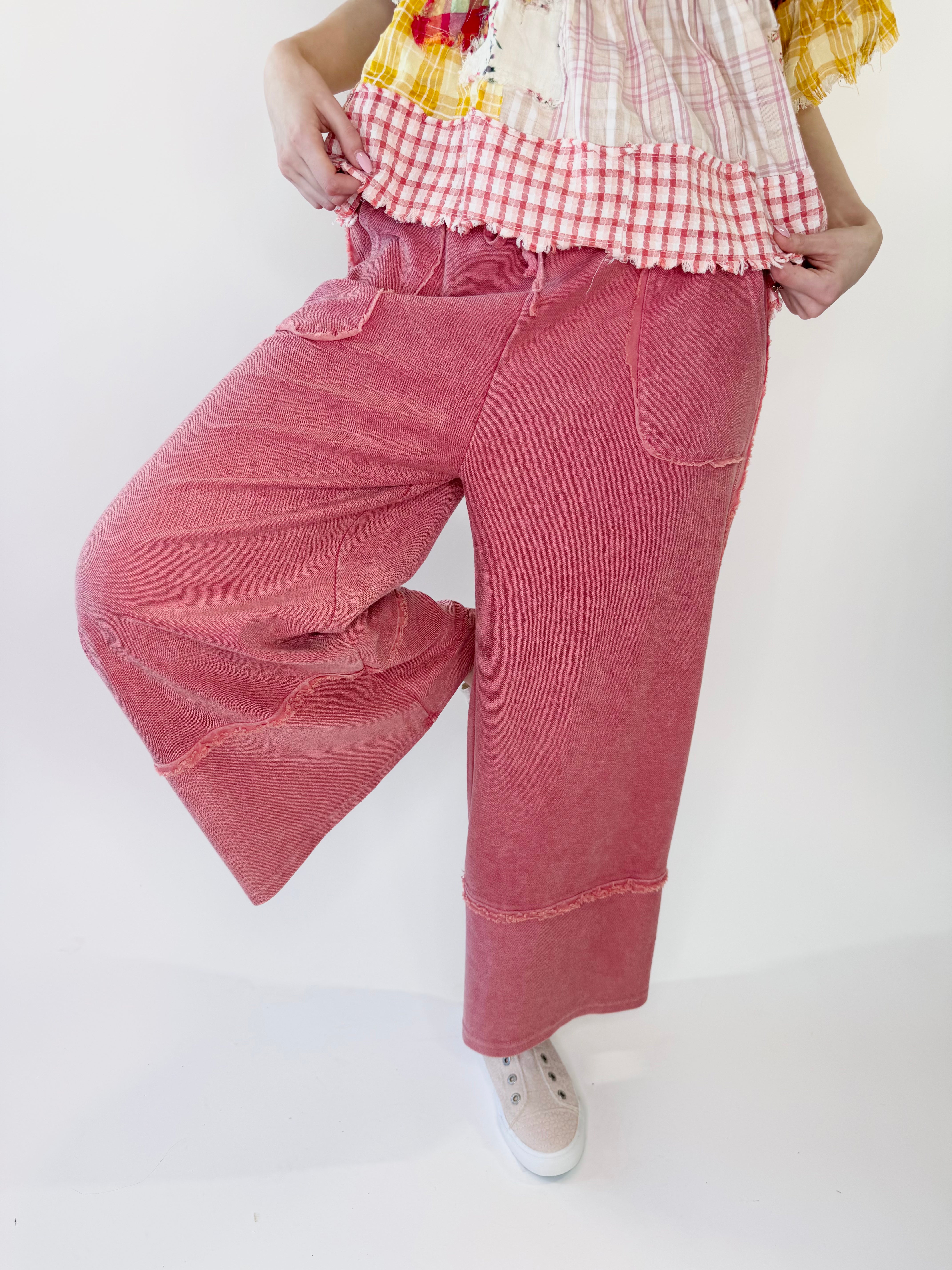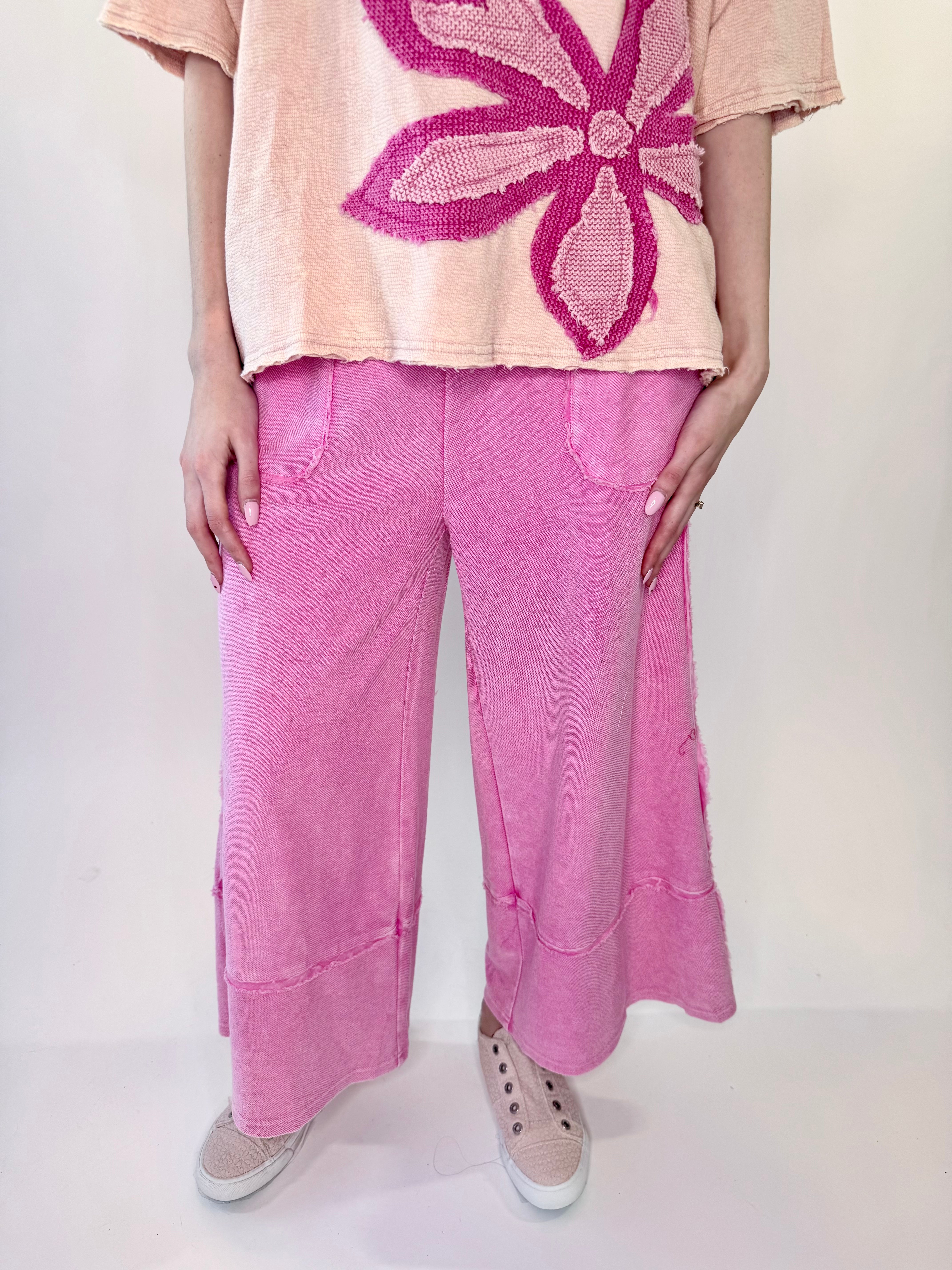 Laid-back comfort meets your every day effortless style in these mineral washed terry palazzo pants. Designed with a relaxed wide leg silhouette and soft knit feel, they deliver all-day comfort with a touch of lived-in charm. The elastic waistband and adjustable drawstring offer a flexible fit, while raw cut and frayed seam detailing add that perfectly undone finish.