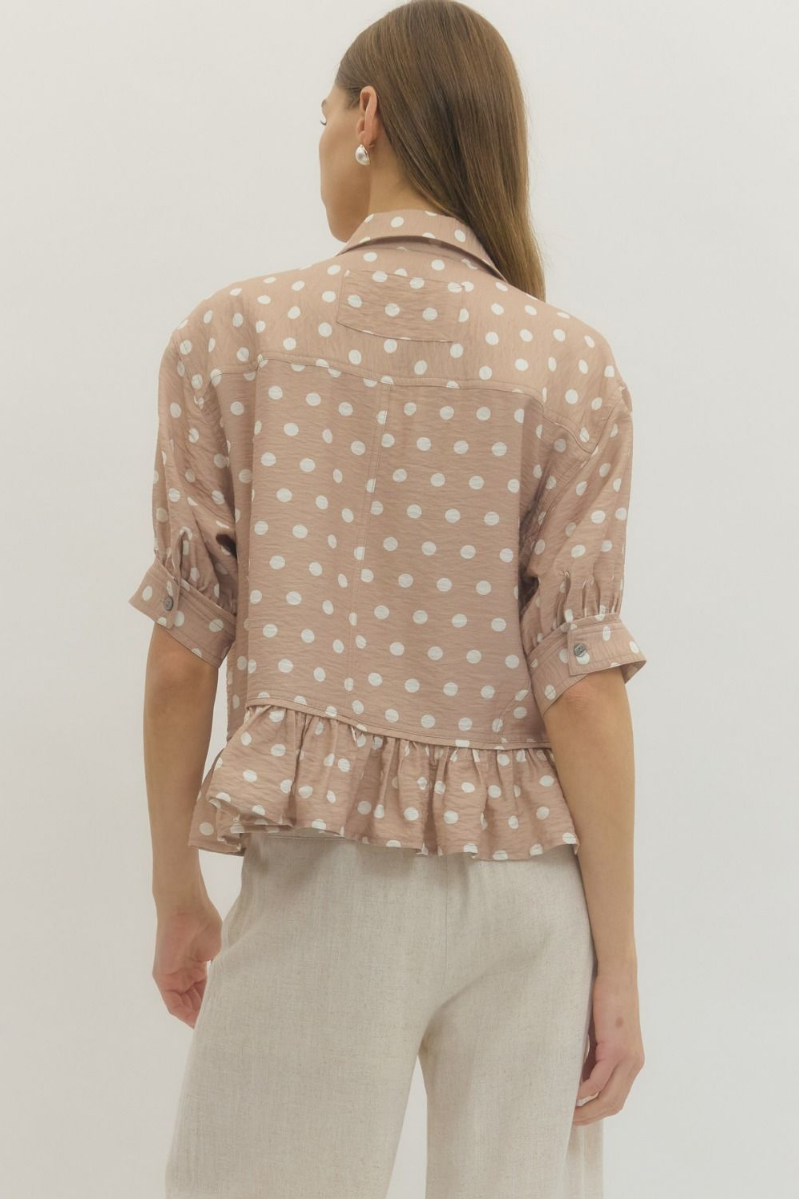 Playful and polished, this polka dot short sleeve top brings a charming twist to a classic silhouette. Designed with a flattering waist-length cut, it features a soft ruffle hem that adds movement and a feminine finish to the look.